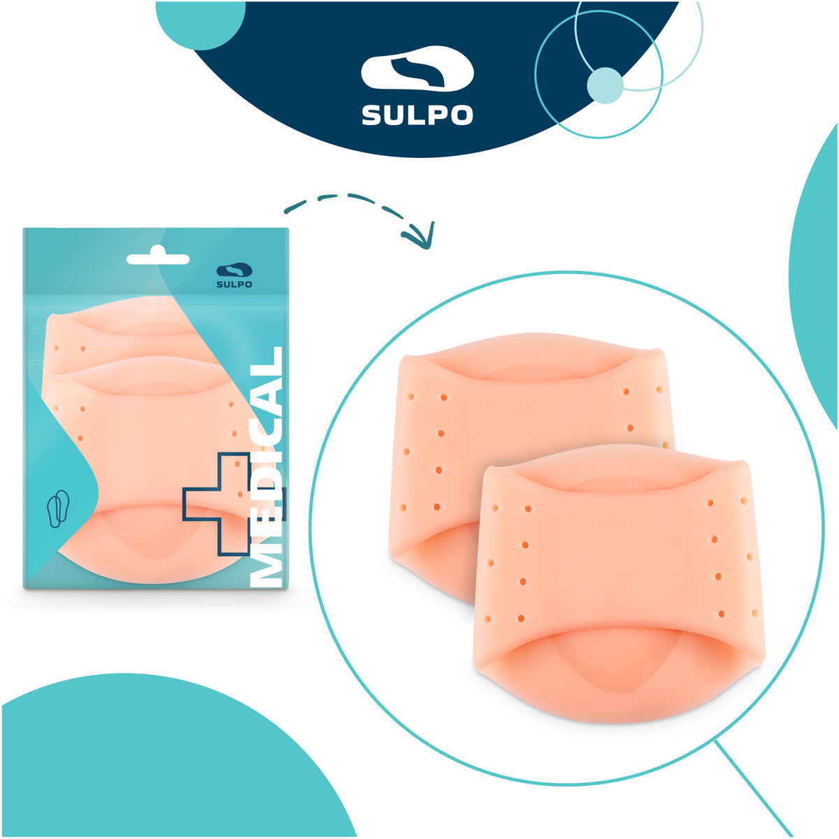 Wykonane z miękkiego i elastycznego silikonu, dobrze trzymają się stopy, a dzięki otworom na opasce nie powodują obtarć ani podrażnień. Żelowa poduszka podpiera sklepienie wzdłużne stopy, dając ulgę nadwerężonemu ścięgnu.