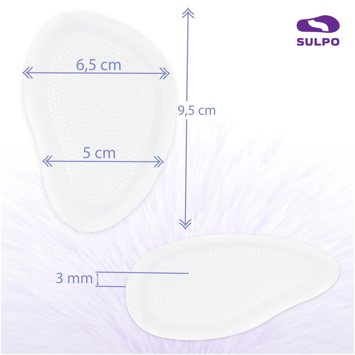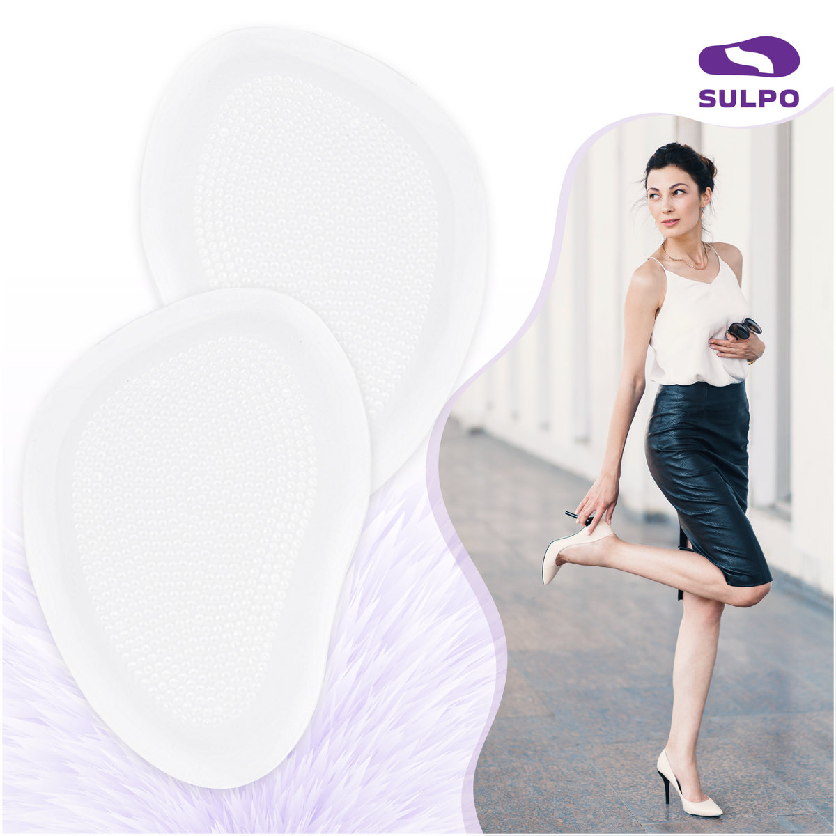 Pół wkładki żelowe przeznaczone do butów na wysokim obcasie. Zapobiegają zsuwaniu się stopy w bucie. Miękki żel amortyzuje przednią część stopy.