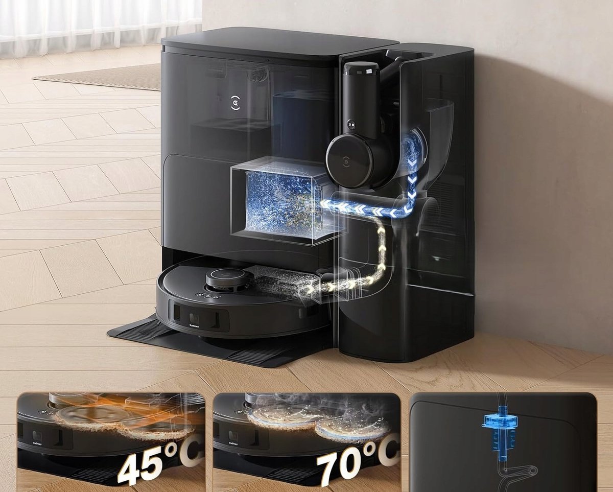 [Ulepszona stacja All-in-One OMNI] Nowa stacja wielofunkcyjna obsługuje mycie mopa gorącą wodą o temperaturze 70°C, automatycznie usuwa kurz i brudną wodę. Przyjmuje ona również suszenie mopa na gorące powietrze. Podwójny system odsysania umożliwia obu odkurzaczom opróżnienie pojemnika na kurz do dużego worka na kurz stacji bazowej. Ta stacja OMNI zawsze idealnie przygotowuje DEEBOT T30S COMBO COMPLETE do następnego procesu czyszczenia. Wygodny i zawsze gotowy do użycia.