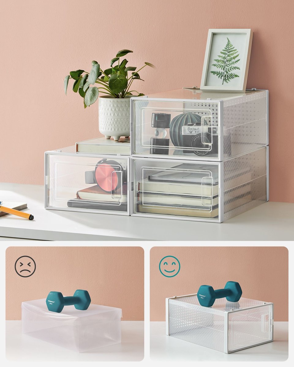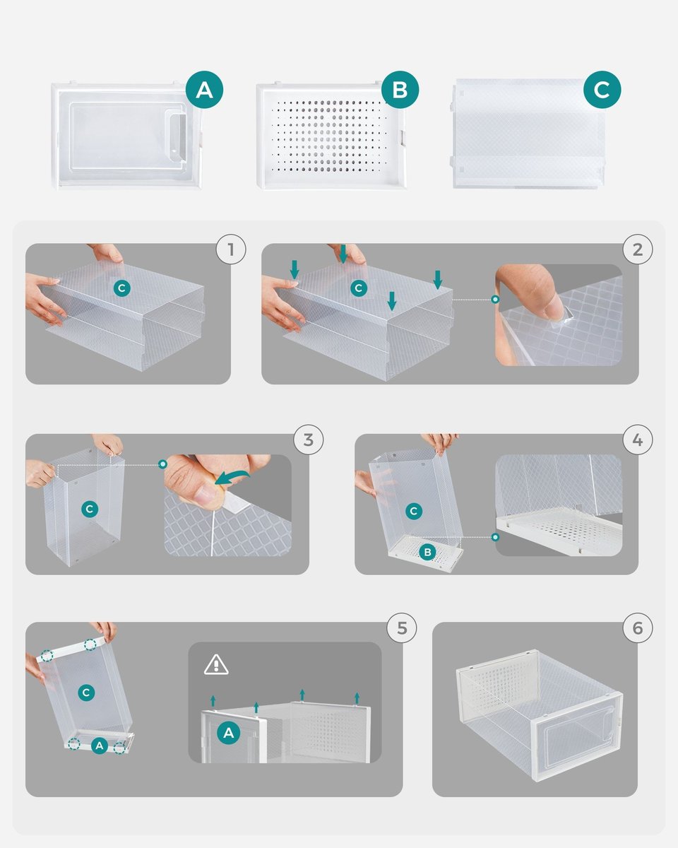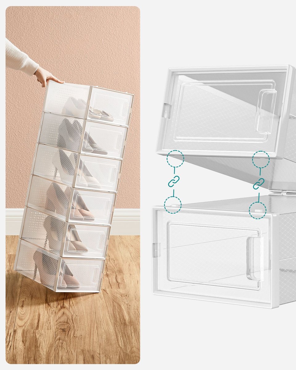 Komplet 12 przezroczystych organizerów na buty to idealne rozwiązanie do uporządkowania obuwia, zapewniając jednocześnie oszczędność miejsca. Każde pudełko jest składane i łatwe w montażu – wystarczy