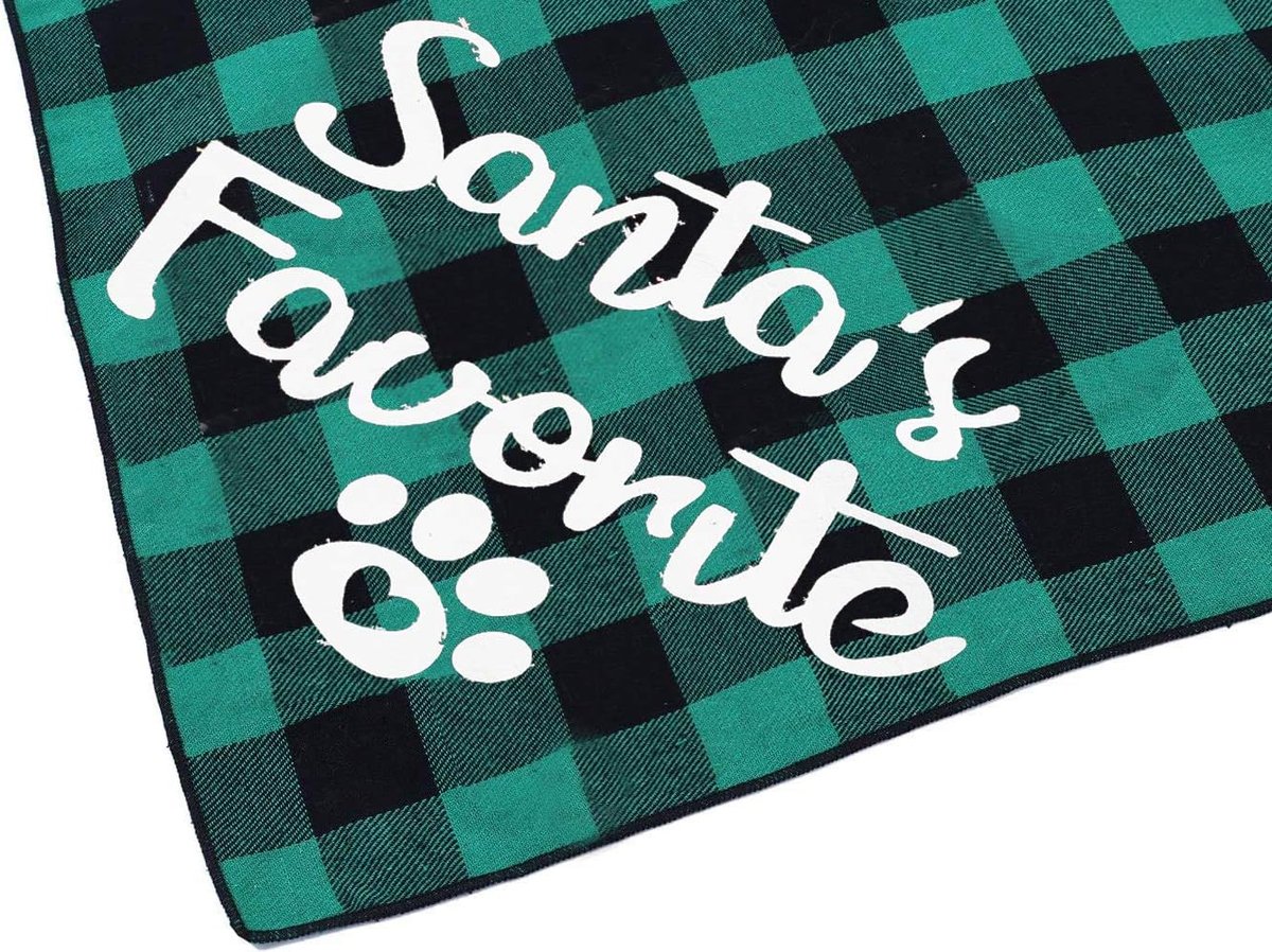 Świętuj razem święta Bożego Narodzenia ze swoim psem! 1 zestaw zawiera 2 bandany dla zwierząt: wzór WESOŁYCH ŚWIĄT w czerwoną kratę, ULUBIONE przez Świętego Mikołaja w zieloną kratę Miękki bawełniany