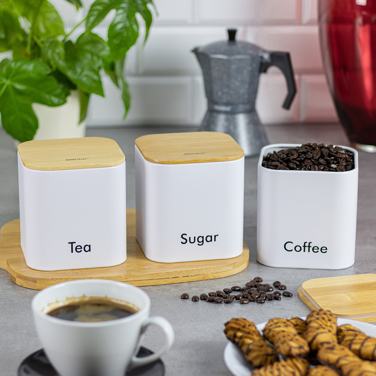 Zestaw 3 pojemników z pokrywkami bambusowymi do przechowywania produktów sypkich. Produkt firmy KINGHOFF Korpus z lakierowanej stali nierdzewnej w kolorze białym. Na pojemnikach napisy Sugar, ...