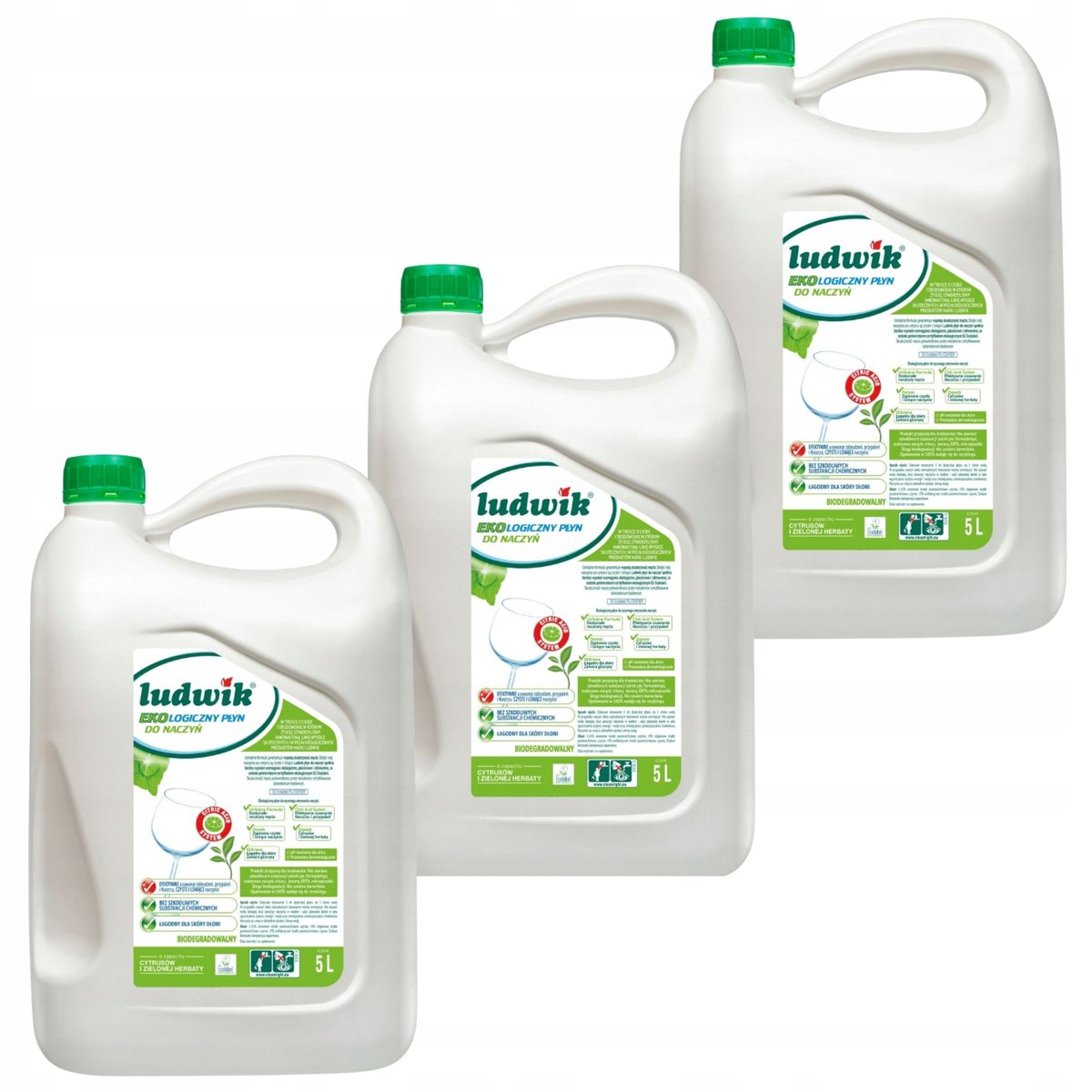 Zestaw 3 płynów do mycia naczyń Ludwik Ekologiczny 5LPłyn do naczyń o zapachu cytrusów i zielonej herbaty, biodegradowalny, bez szkodliwych substancji chemicznych, łagodny dla skóry dłoni ...