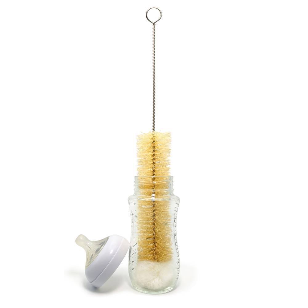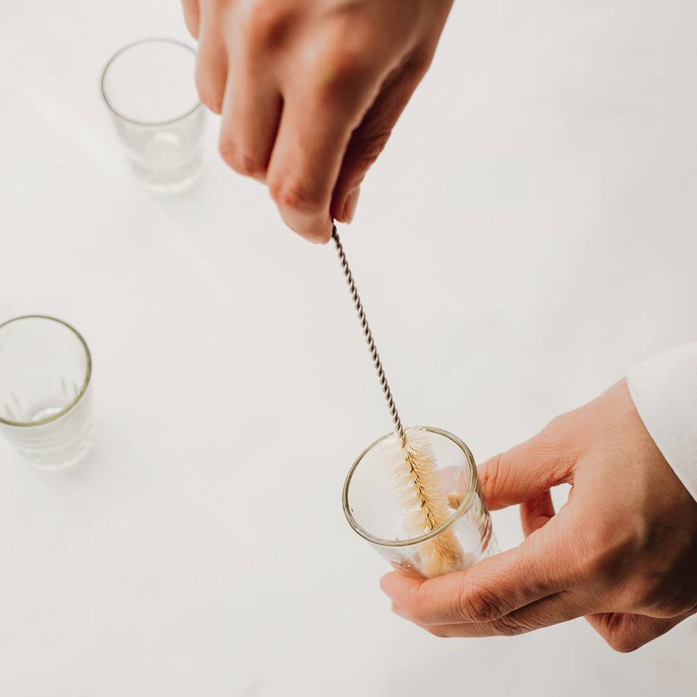 Kompletny zestaw szczotek do butelek nie zawiera plastiku. Składa się z rączki ze stali nierdzewnej, sizalowego włosia i miękkiej bawełnianej końcówki, która zapobiega zarysowaniom. Sizal pozyskiwany jest z agawy i całkowicie naturalnego, wegańskiego surowca. Drut wykonany ze stali nierdzewnej jest mocny, a jednocześnie elastyczny. Możesz go łatwo zgiąć i nadać mu kształt, aby dotrzeć do wszystkich obszarów wszystkich naczyń szklanych.