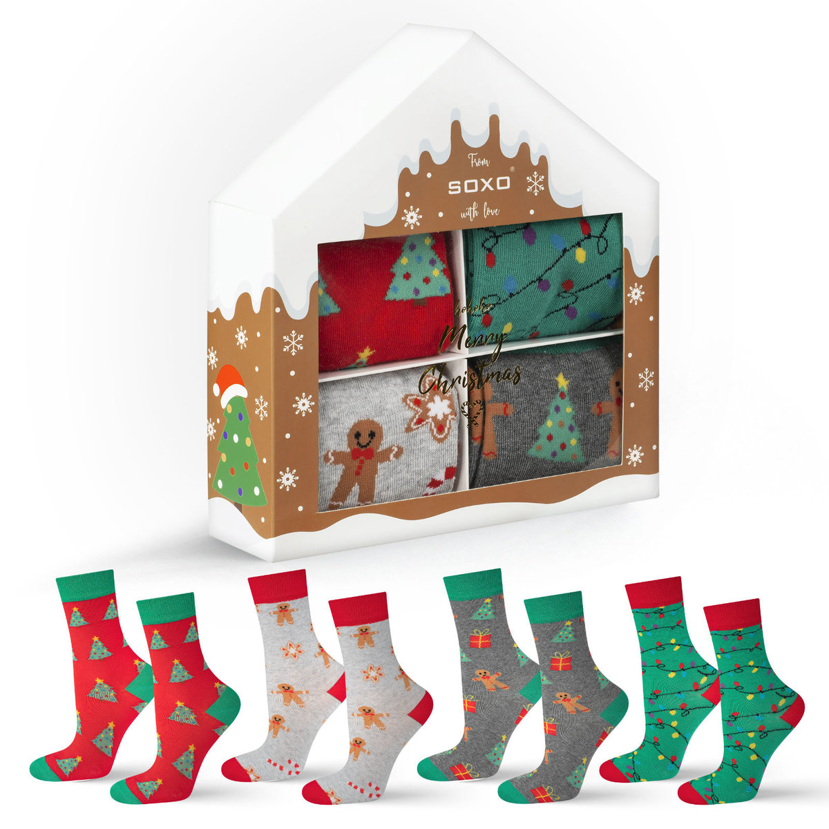Zestaw zawiera: 1x skarpetki piernikowe ciastko i prezenty 1x skarpetki lampki choinkowe 1x skarpetki drzewko bożonarodzeniowe 1x skarpetki świąteczne smakołyki Modne skarpetki SOXO z pewnością ...