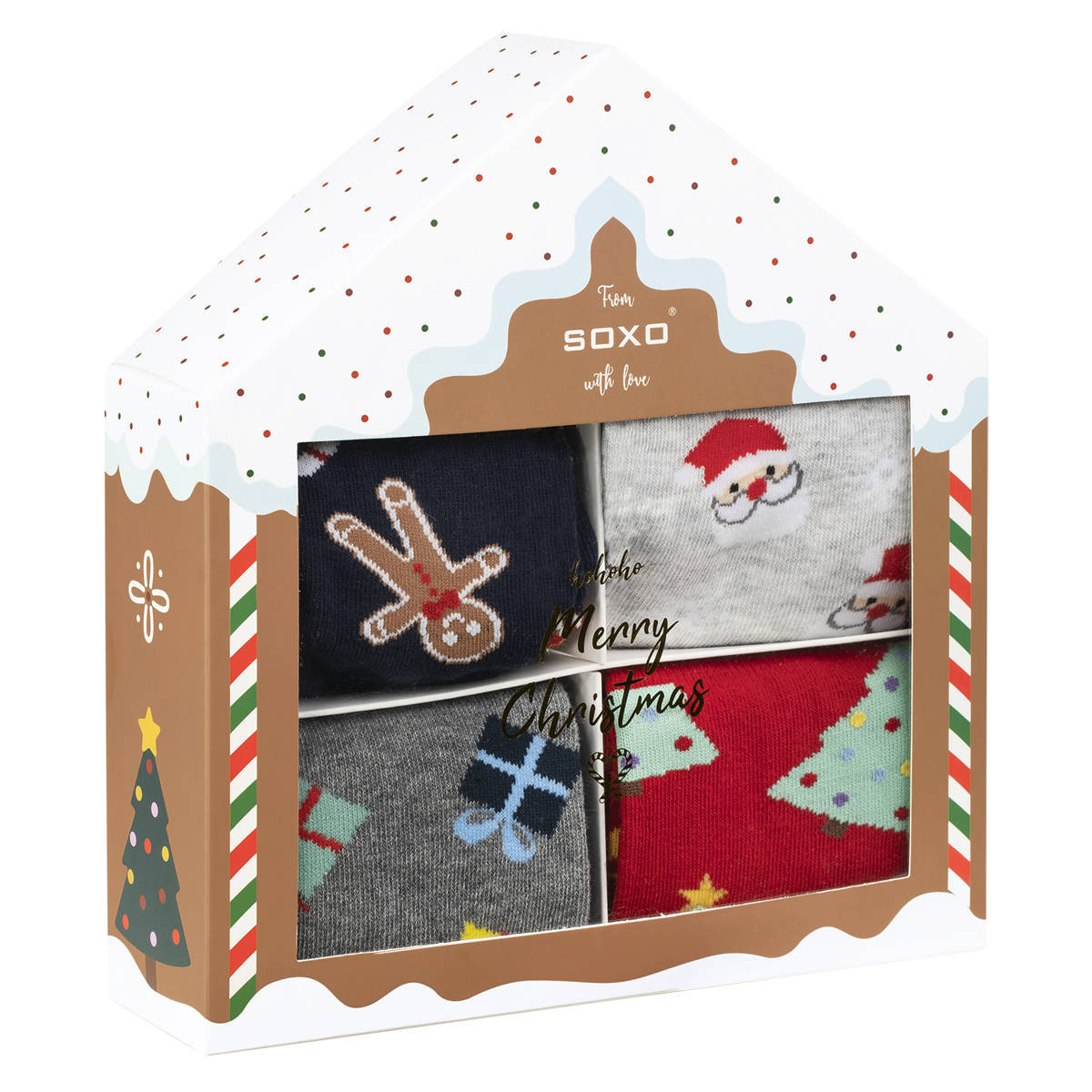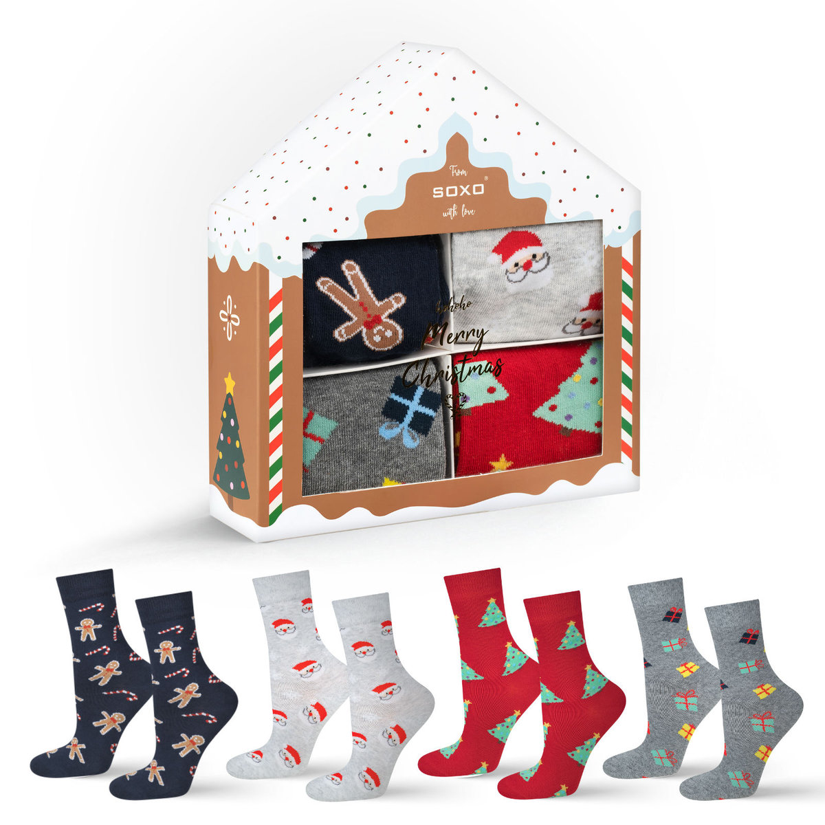 Zestaw zawiera: 1x skarpetki piernikowe ciastko 1x skarpetki mikołaje 1x skarpetki choinki 1x skarpetki świąteczne prezenty Modne skarpetki SOXO z pewnością ucieszą wszystkie Panie lubiące nosić ...
