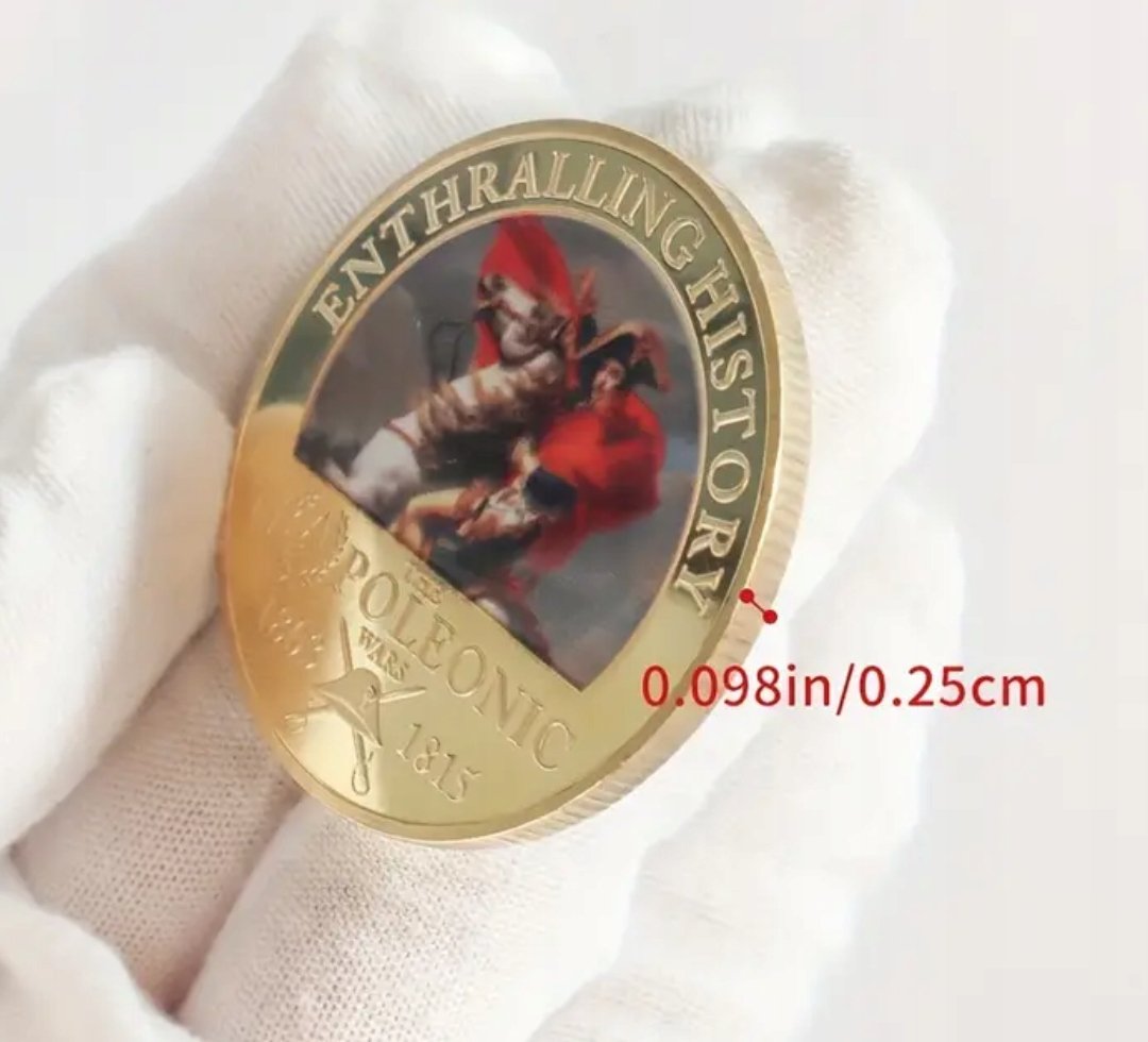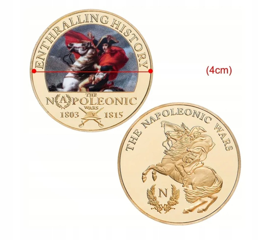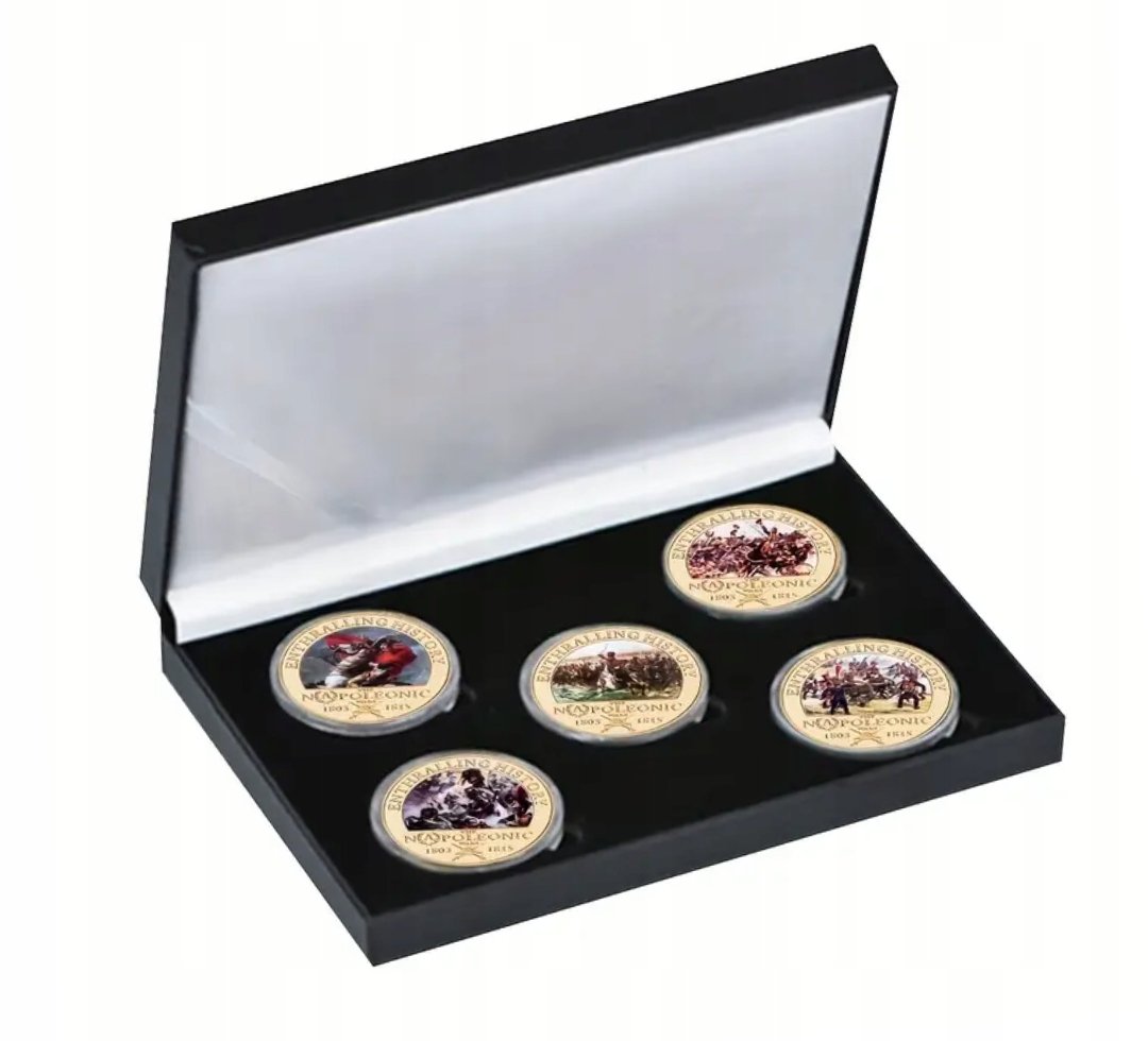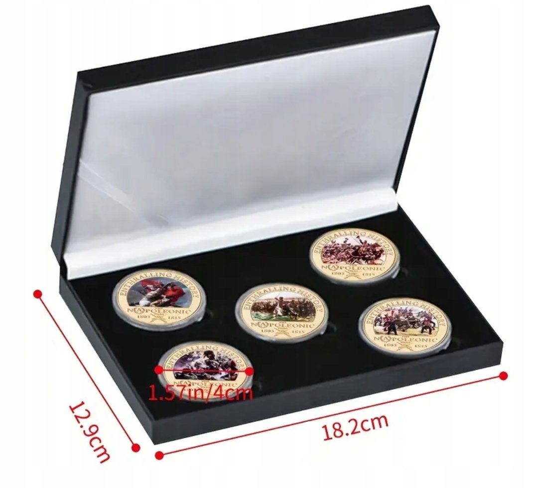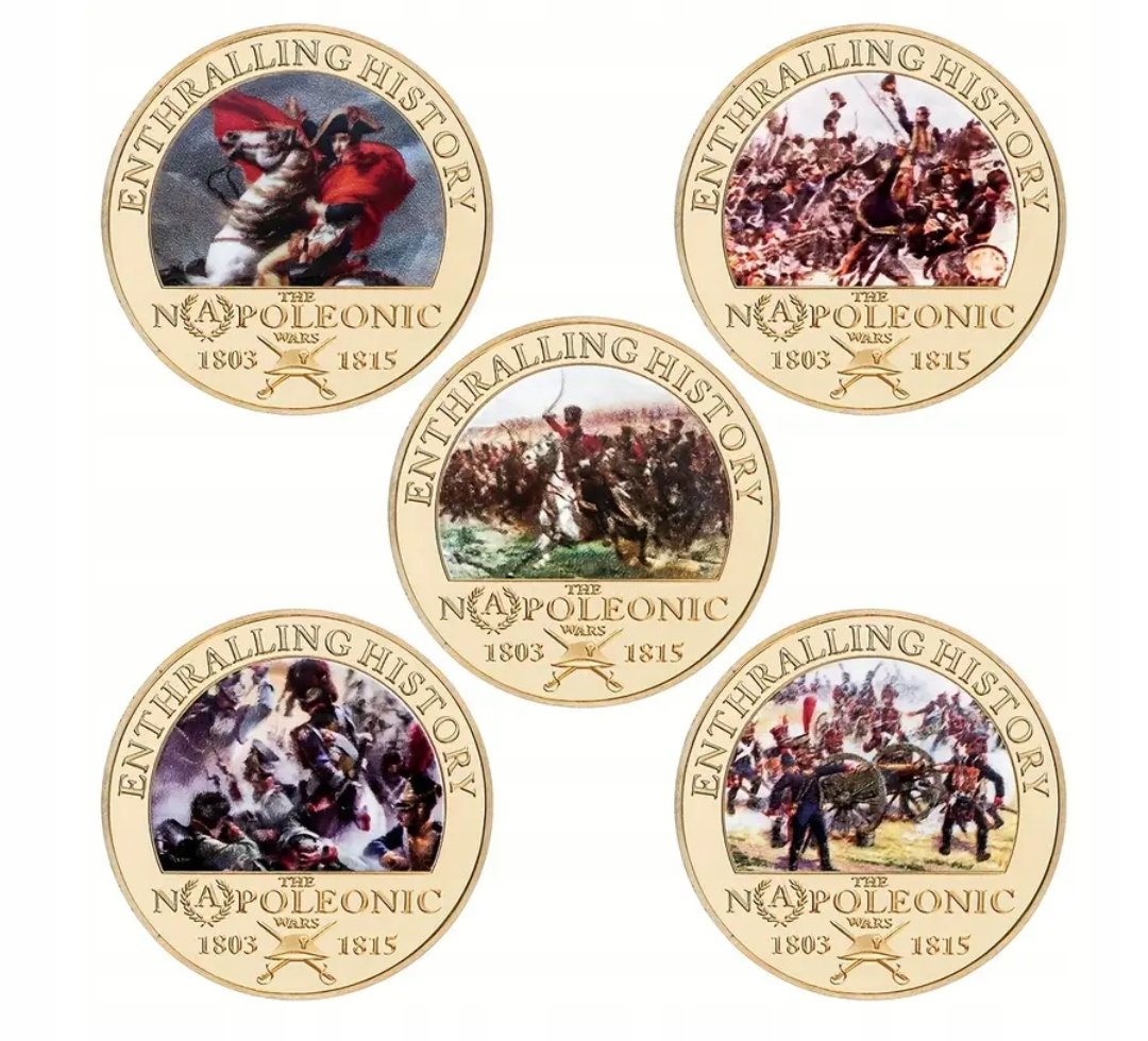 Unikalny zestaw 5 pamiątkowych monet poświęconych najważniejszym bitwom Napoleona. Każda moneta została wykonana z trwałego żelaza i pokryta pozłacanym wykończeniem, a precyzyjne rysunki przedstawiają kluczowe momenty historyczne.