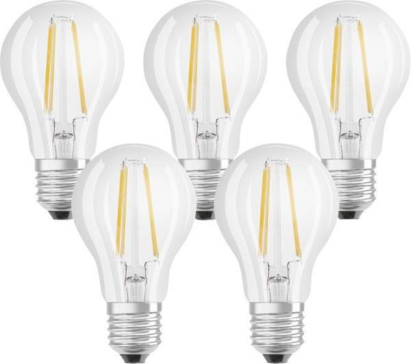 Zestaw 5x Żarówek LED filament OSRAM, E27, 7 W = 60 W, 806 lm, 2700 K Osram Trzonek: E27 Moc: 7W Strumień świetlny (lumeny): 806lm Odpowiada żarówce o mocy: 60W Kształt żarówki: ...