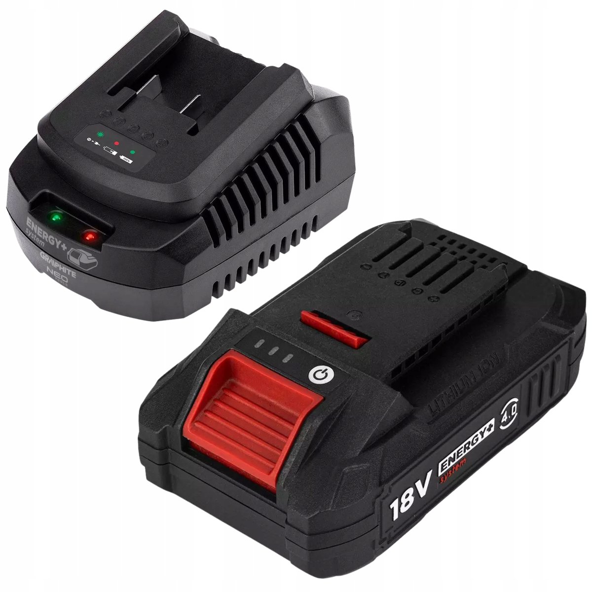 Akumulator 4 Ah + Ładowarka do akumulatorów Graphite Energy+ Zestaw zawiera: 58G004 Akumulator Energy+ 18V, Li-Ion 4.0Ah 58G002 Ładowarka do akumulatorów Energy+ Akumulator ...