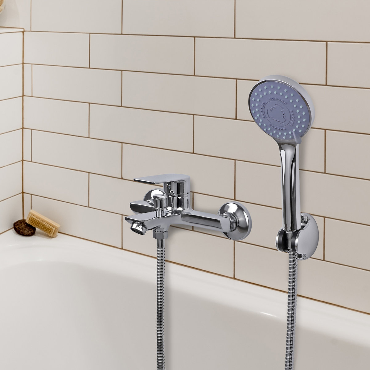 ✦ bateria wannowo-prysznicowa, ścienna, jednouchwytowa ze stałą wylewką i ciśnieniowym przełącznikiem strumienia wody,
