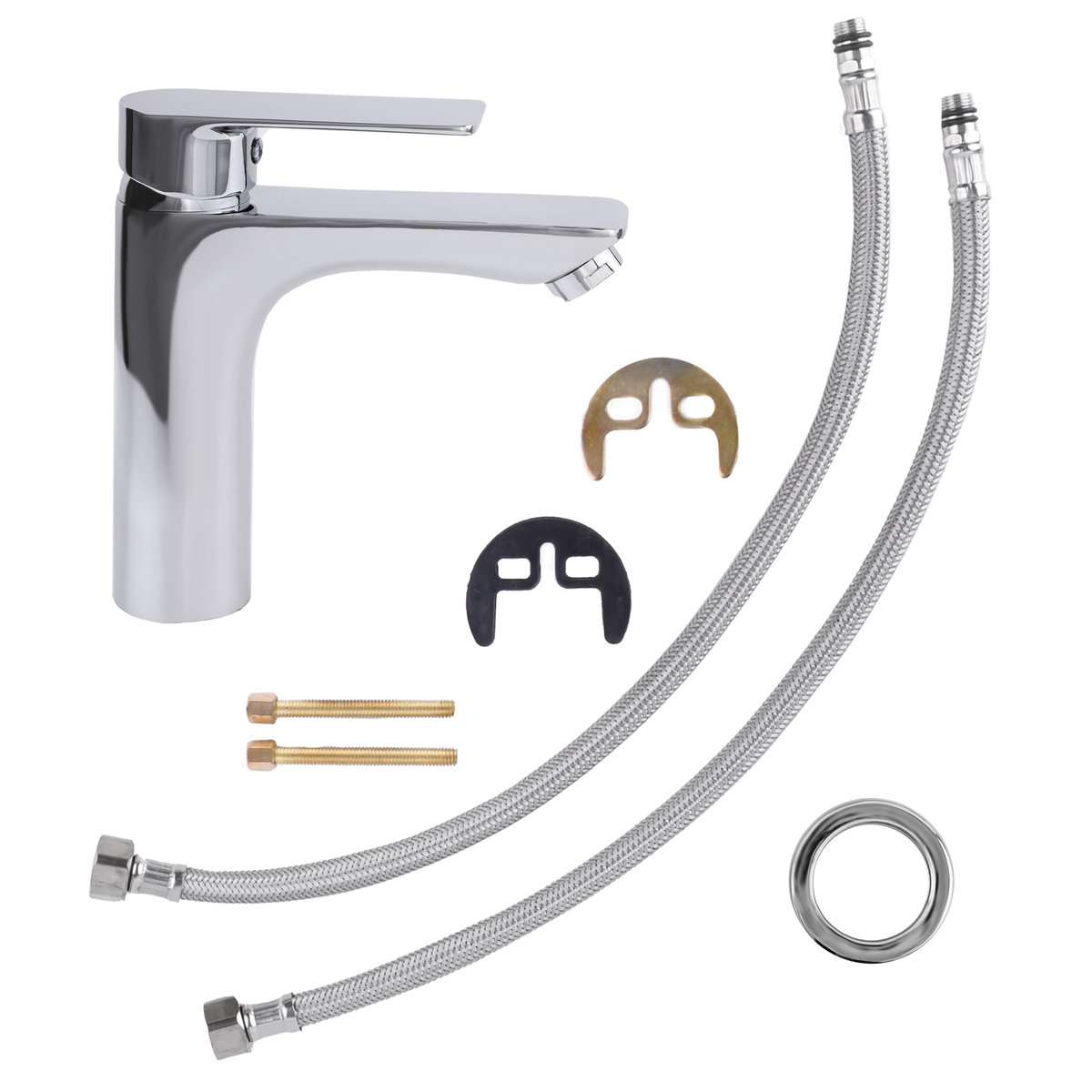 ✦ bateria umywalkowa z perlatorem napowietrzającym strumień wody, 2 wysokiej jakości wężyki w oplocie ze stali nierdzewnej o długości 40 cm ze standardowym przyłączem 3/8 cala oraz komplet akcesoriów do montażu baterii;