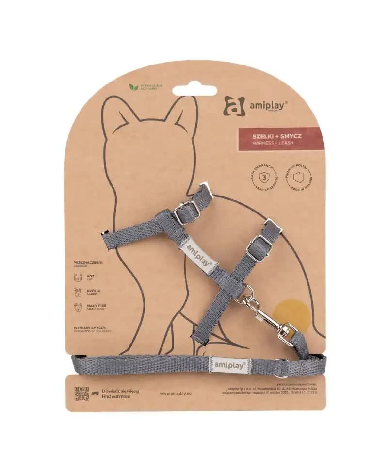 Zestaw spacerowy dedykowany dla kotów: szelki ze smyczą. Kolor szary. Rozmiar M.Amiplay to polska firma, której ideą jest zapewnienie wygody i bezpieczeństwa zarówno Pupilom jak i ich ...