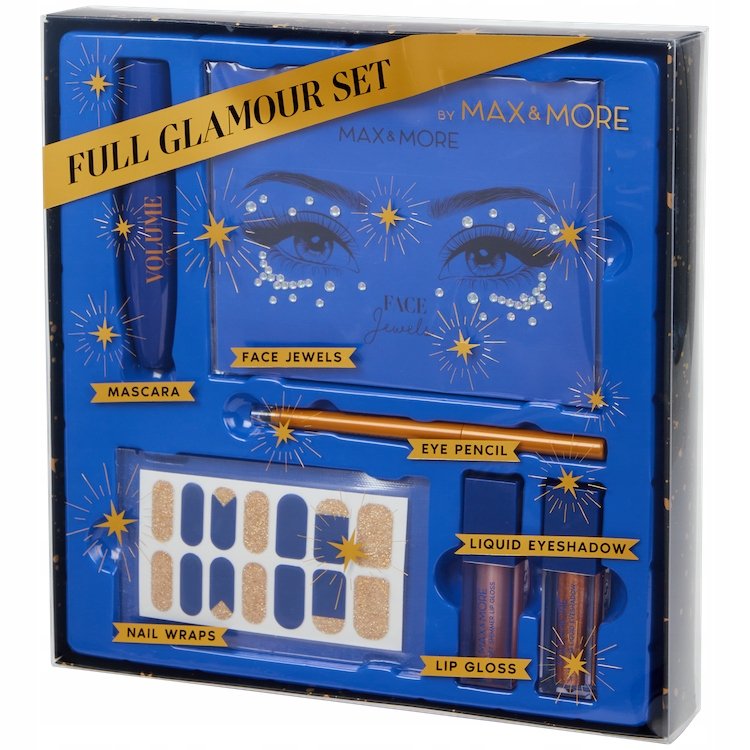 Dzięki zestawowi Max&More masz wszystko, co potrzebne, aby stworzyć idealny look na imprezę lub festiwal. Zestaw zawiera tusz do rzęs, błyszczyk do ust, cień do powiek, kredkę do oczu, kryształki na twarz i ozdoby na paznokcie.
