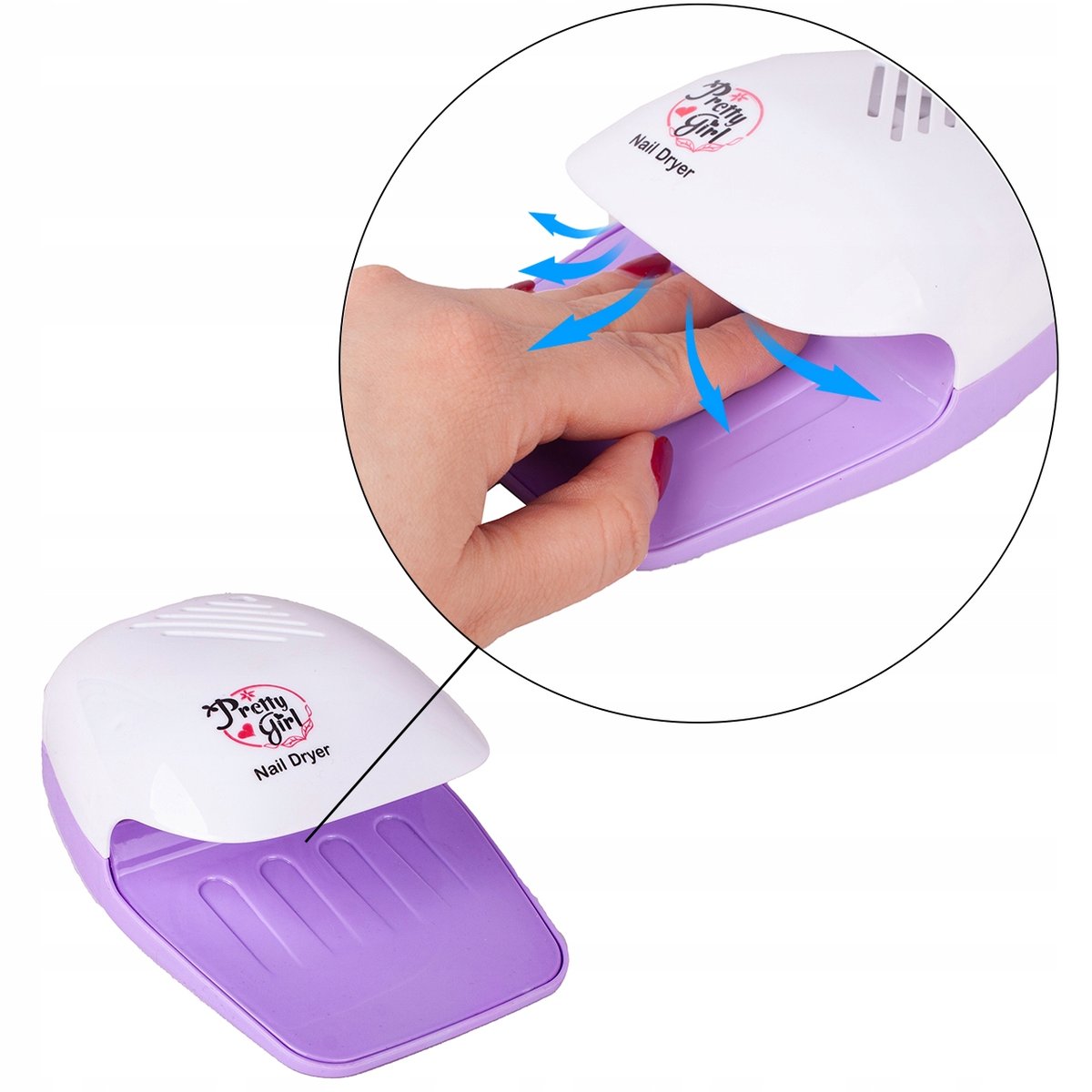 W zestawie znajdziemy urządzenie przypominające lampe do paznokci, jednak ma ona za zadanie dmuchać powietrzem, dzięki któremu lakier na paznokciach wyschnie w krótkim czasie!