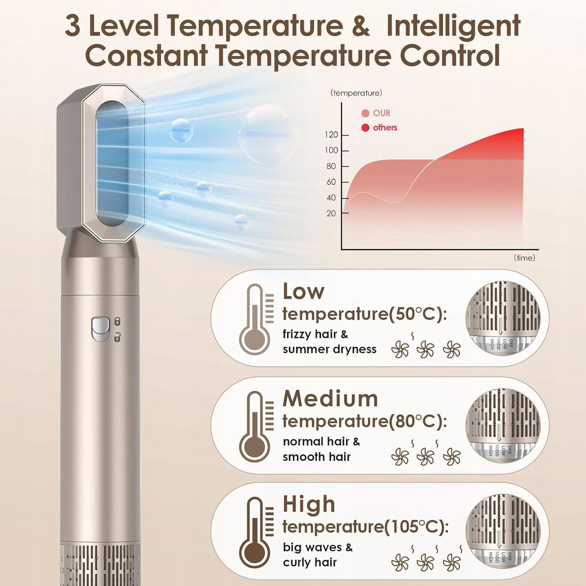 ● Inteligentna regulacja temperatury z trzema prędkościami: regulacja temperatury z trzema prędkościami, odpowiednia do różnych gatunków włosów (delikatnych, średnich, grubych i twardych) oraz potrzeb związanych z stylizacją, od delikatnego kształtowania po formowanie w wysokiej temperaturze, elastyczny wybór.