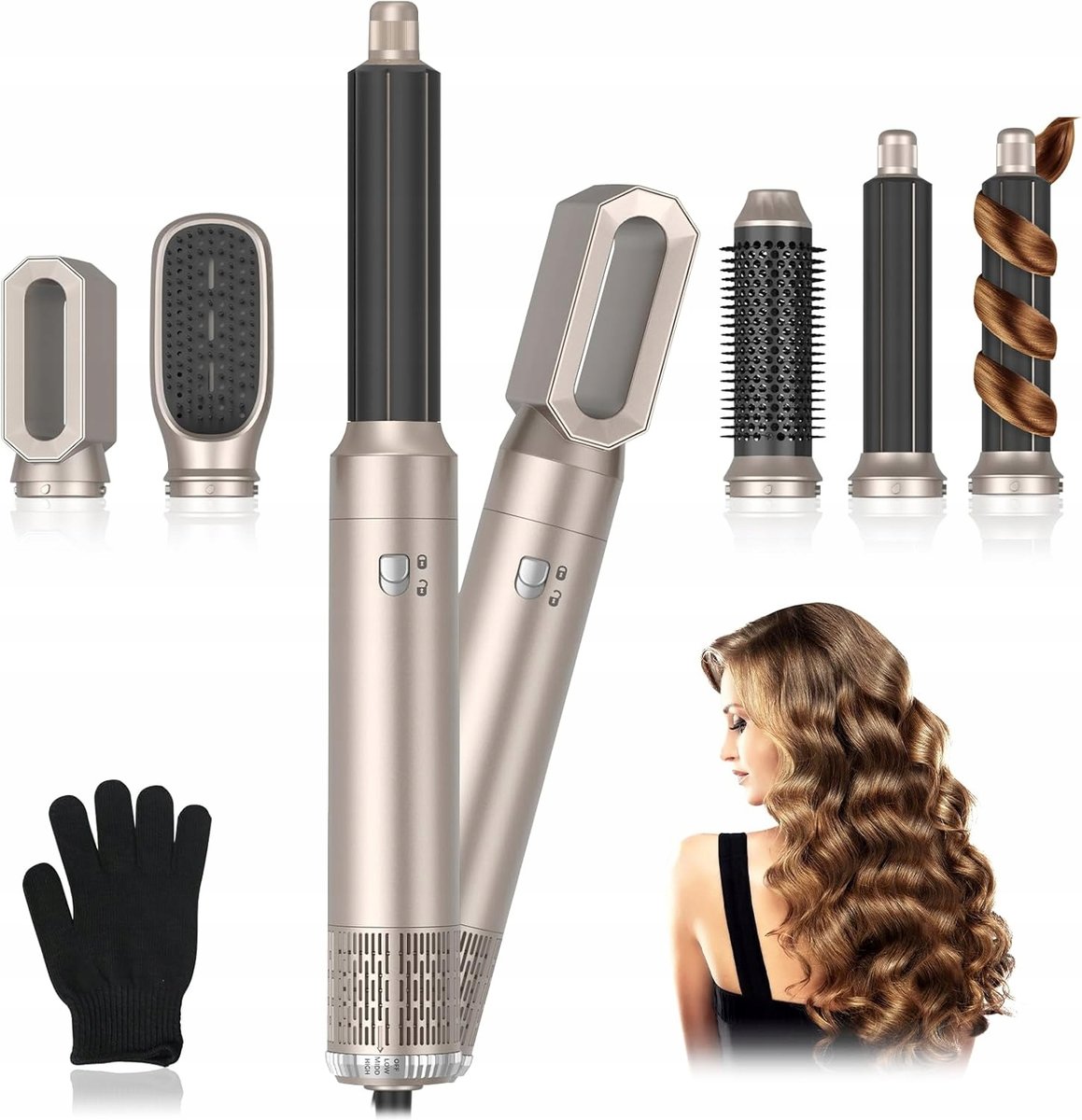 ● Wielofunkcyjny zestaw szczotek do suszarki do włosów 5 w 1 to wysokiej jakości urządzenie do higieny osobistej, które obejmuje suszarkę do włosów, prostowanie, kręcenie, utrwalanie włosów i grzebienie na gorące powietrze. Wyposażony w pięć wymiennych końcówek szczoteczek, możesz wybrać w zależności od efektu i potrzeb stylizacji oraz prostego, prostego lub dużych fal.