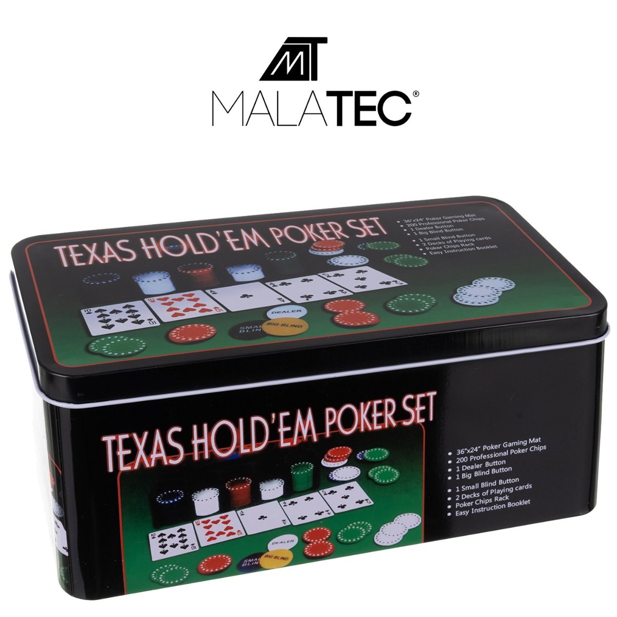 SPECYFIKACJA - producent: Iso Trade; marka: MALATEC; material: żelazo cynowane - 2 talie kart papier, sukno do gry poliester, żetony (PP), stelaż na żetony PPwymiary maty: 92 x 58cm; waga 1 żetonu: ok. 4 g; waga zestawu: 1,547 kg; waga zestawu w opakowaniu: 1,682 kg.