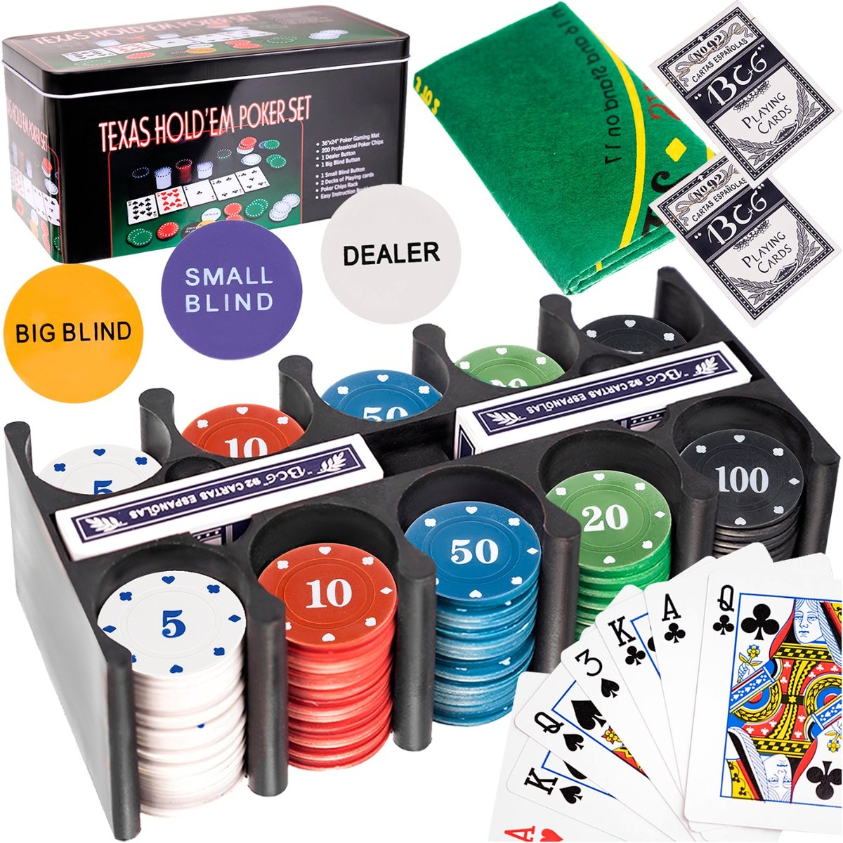 KOMPLETNY ZESTAW – w naszym zestawie oferujemy: 2 talie papierowych kart, 200 żetonów, 3 żetony funkcyjne, zielone sukno / matę do gry oraz solidną zamykaną puszkę.