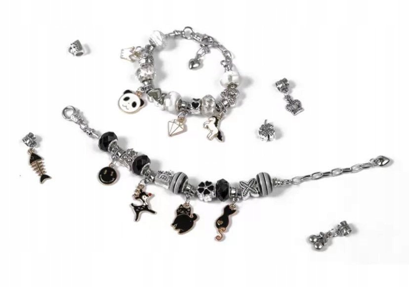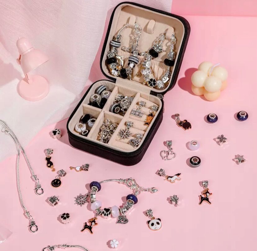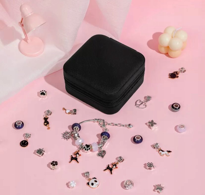 Zestaw zawiera praktyczny kuferek, który ułatwia przechowywanie zawieszek i elementów bransoletek, zapewniając porządek i wygodę.