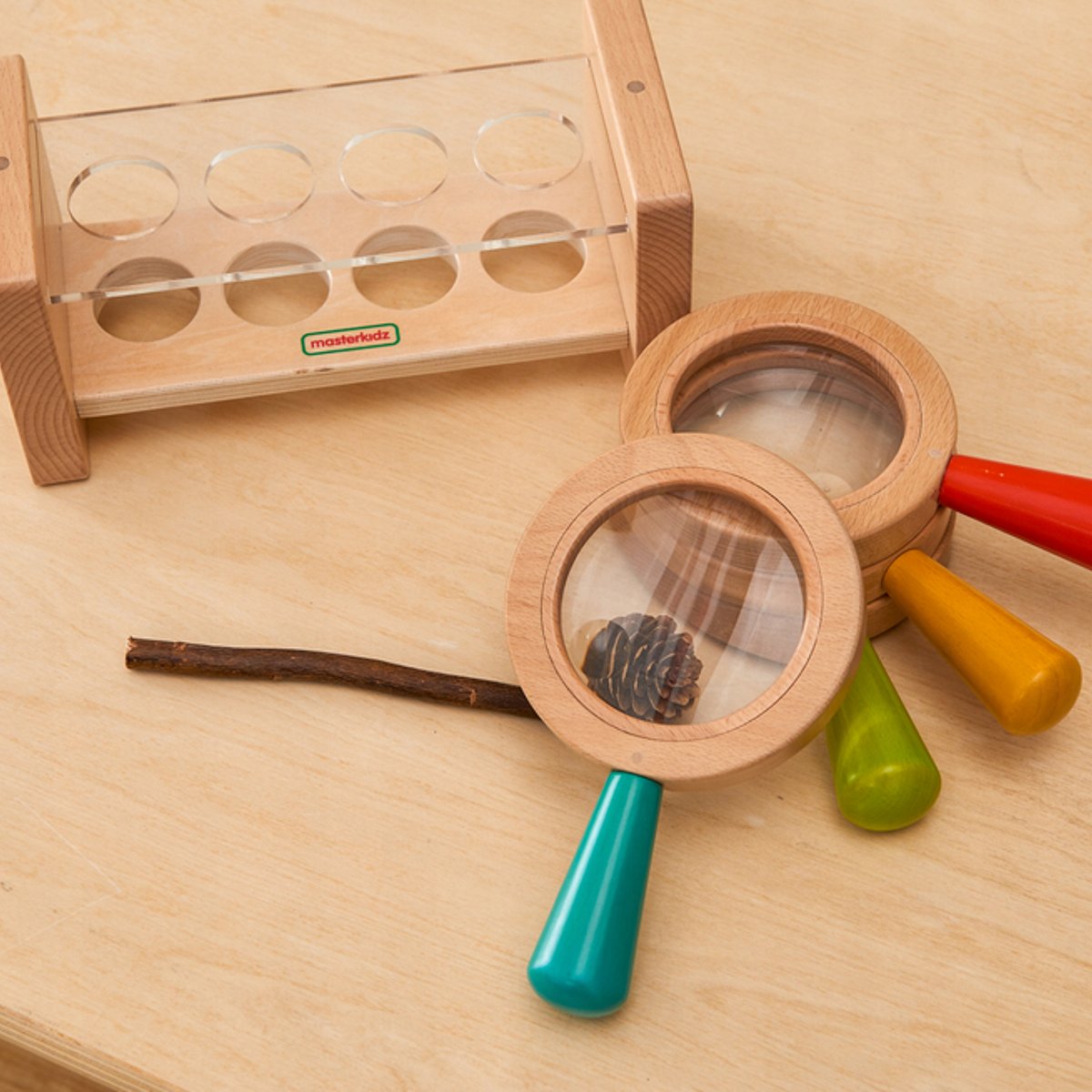 Pozwól dziecku zamienić się w małego odkrywcę dzięki wyjątkowemu zestawowi lup z drewnianym stojakiem! W skład zestawu wchodzą cztery solidne lupy z dużymi, przezroczystymi soczewkami o powiększeniu, które doskonale nadają się do badania roślin, owadów czy innych skarbów natury. Każda lupa ma ergonomiczny, drewniany uchwyt w żywych kolorach (czerwonym, zielonym, żółtym i niebieskim), dostosowany do małych rączek. Do zestawu dołączony jest drewniany stojak z przezroczystą osłoną 3 Charakterystyka : ️4 lupy z drewnianymi uchwytami w różnych kolorach