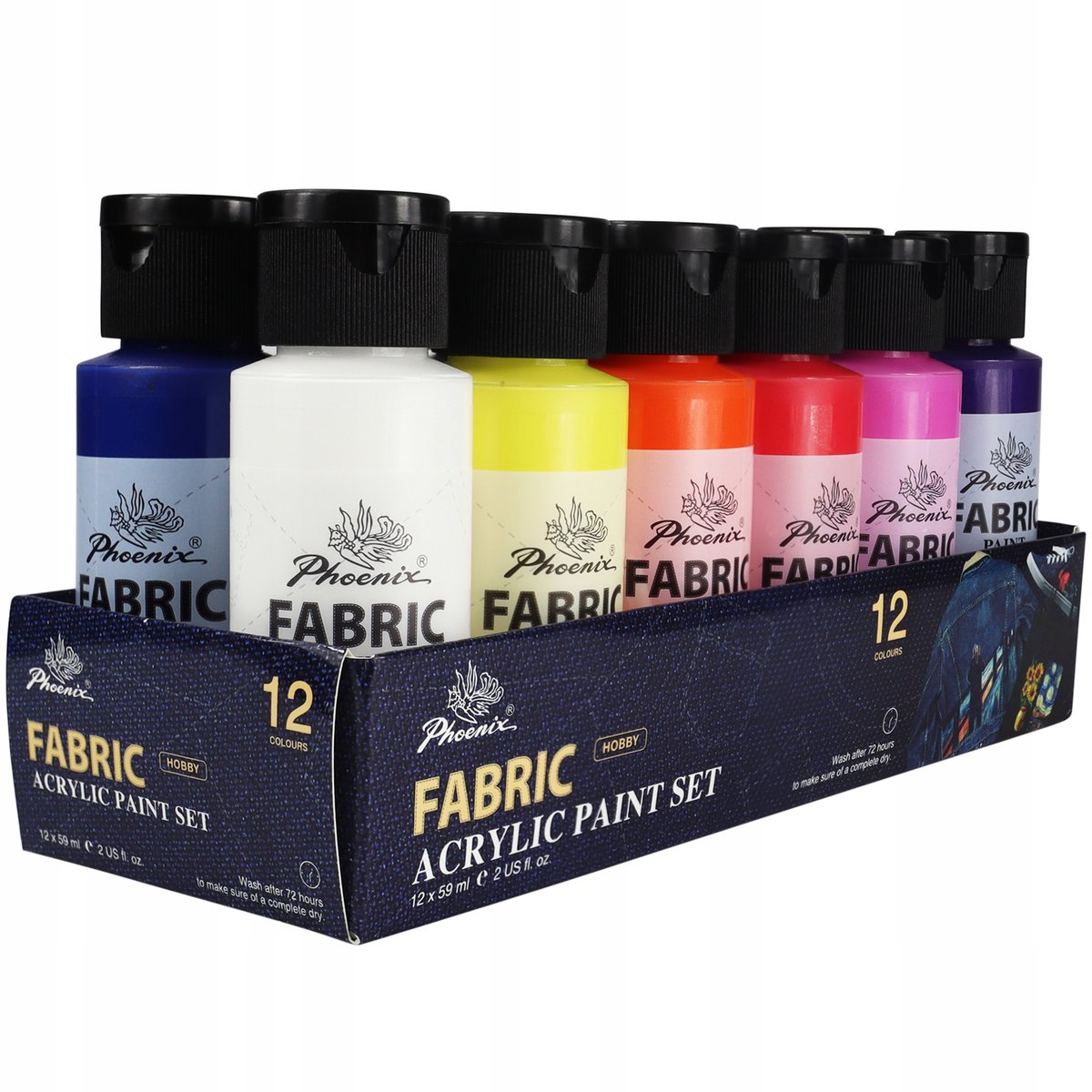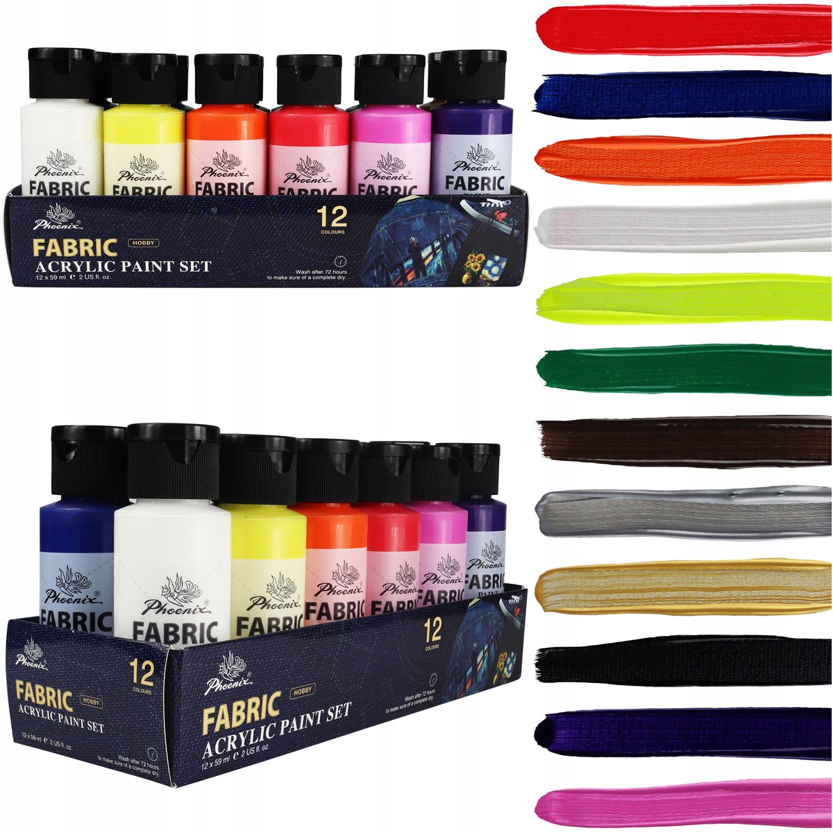 | Nazwa: | Farby do Tkanin Phoenix 12×59 ml – Zestaw do Malowania Ubrań (koszulki, spodnie) | Intensywne kolory, odporne na pranie |