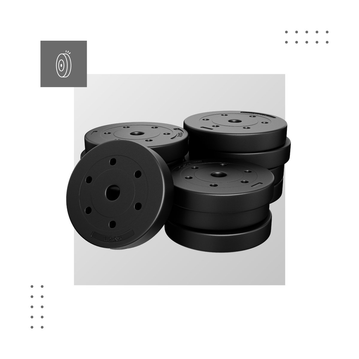 - W zestawie: dwa gryfy, łączenie, cztery zaciski i 12 talerzy obciążeniowych - 2 kg ( 4 sztuki), 1.25 kg ( 4 sztuki), 1.5 kg (4 sztuki)