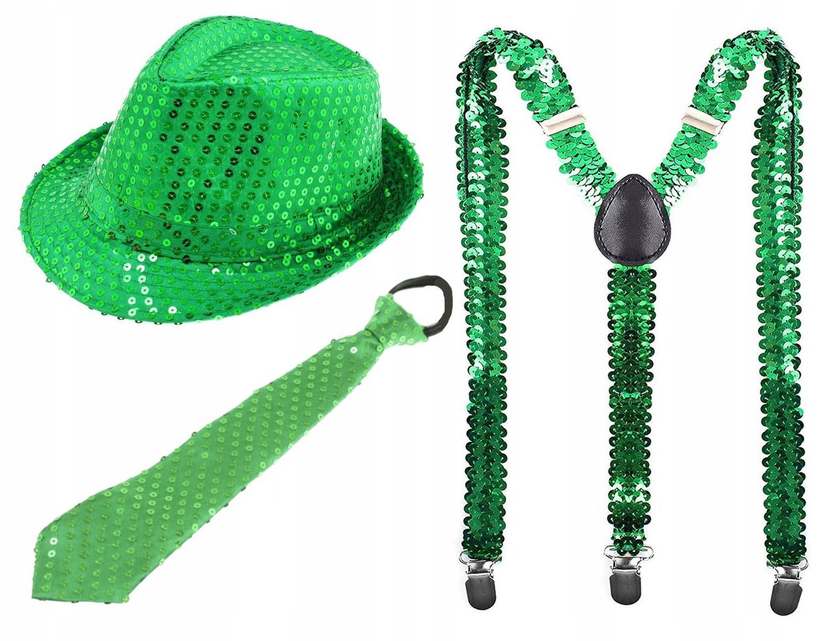 W skład zestawu wchodzą:kapelusz cekinowy w rozmiarze uniwersalnym (pasuje na głowy o obwodzie ok 54-58cm)krawat cekinowy na gumce lub zamku (w zależności od dostawy): długość ok 39cm, szerokość w ...