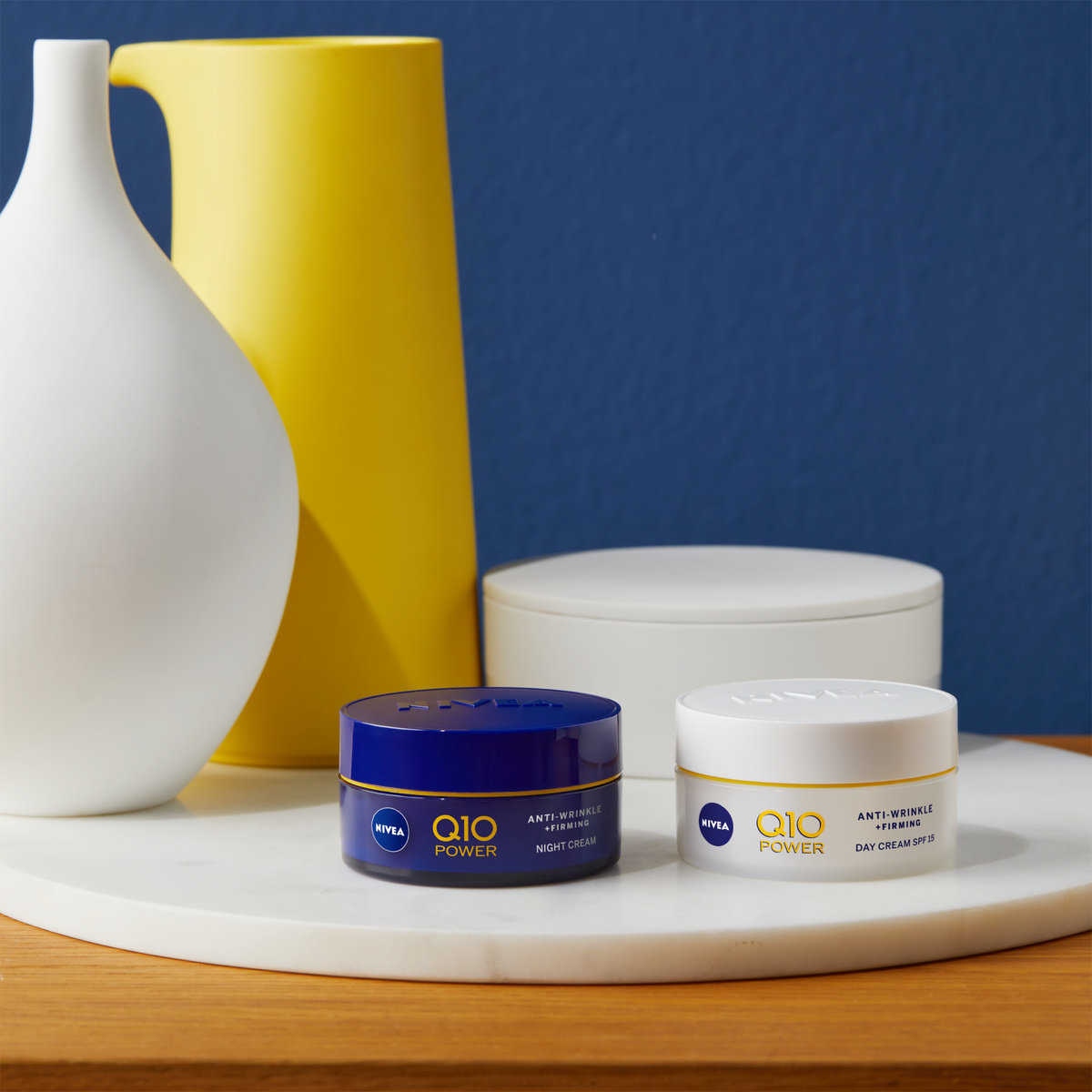 Koenzym Q10 znajduje się w każdej komórce skóry. Daje jej zastrzyk energii i chroni ją, naturalnie zwalczając proces starzenia się skóry. Z wiekiem poziom Koenzymu Q10 w skórze zmniejsza się, przez co staje się ona bardziej narażona na oznaki starzenia się. NIVEA Q10 POWER Przeciwzmarszczkowy + Ujędrnienie Krem na noc z Naturalnym Koenzymem Q10 i Kreatyną, zawiera IDENTYCZNY jak w skórze Koenzym Q10. Otrzymany w procesie fermentacji drożdży ten czysty i naturalnej jakości Koenzym Q10 działa w idealnej harmonii z Twoją skórą. Dodatkowo formuła zawiera Kreatynę, czyli organiczny kwas, który wzmacnia włókna ujędrniające skórę*. W rezultacie Krem Q10 POWER widocznie redukuje zmarszczki, zauważalnie ujędrnia i odżywia skórę. Dodatkowo regeneruje skórę nocą, kiedy jest najbardziej podatna na wchłanianie składników aktywnych.