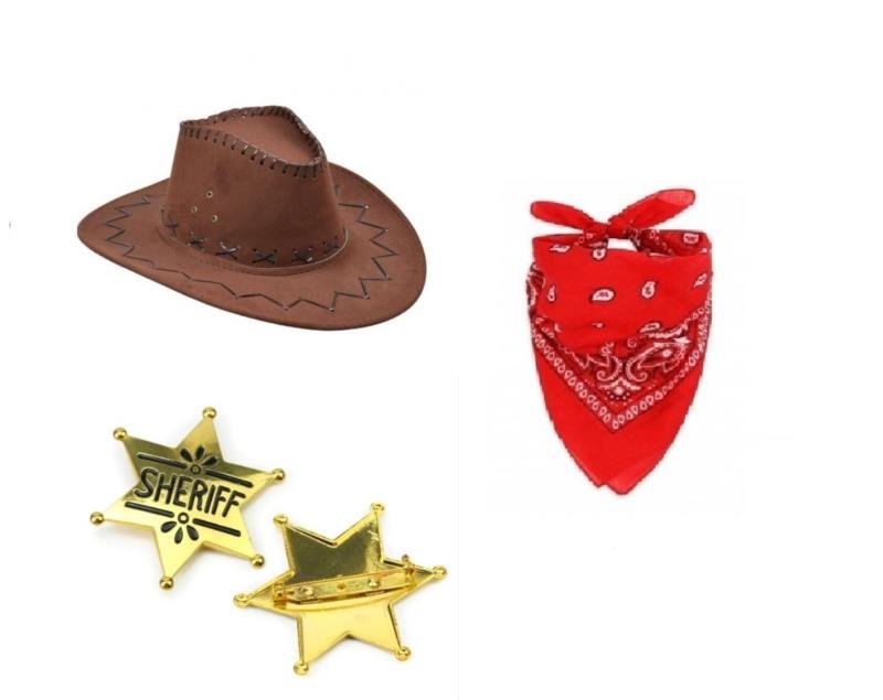 Zestaw Kowboja Kowbojki zawiera:1.Kapelusz Kowbojski Welur Brązowy CC099B Kapelusz kowbojski welurowy brązowy. Wykonany z wysokiej jakości materiału. Idealny na każdą imprezę karnawałową, tematyczną