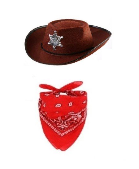Zestaw kowbojski dla dzieci zawiera: - Kapelusz brązowy z gwiazdą CC211 Obwód głowy ok. 50cm - Czerwona materiałowa chusta, bandanka Kwadratowa 50x50cm