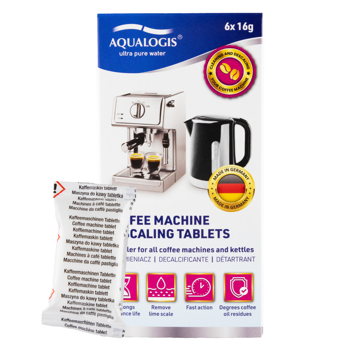 Tabletki odkamieniające Aqualogis Decalc są przeznaczone do ekspresów ciśnieniowych wielu marek.