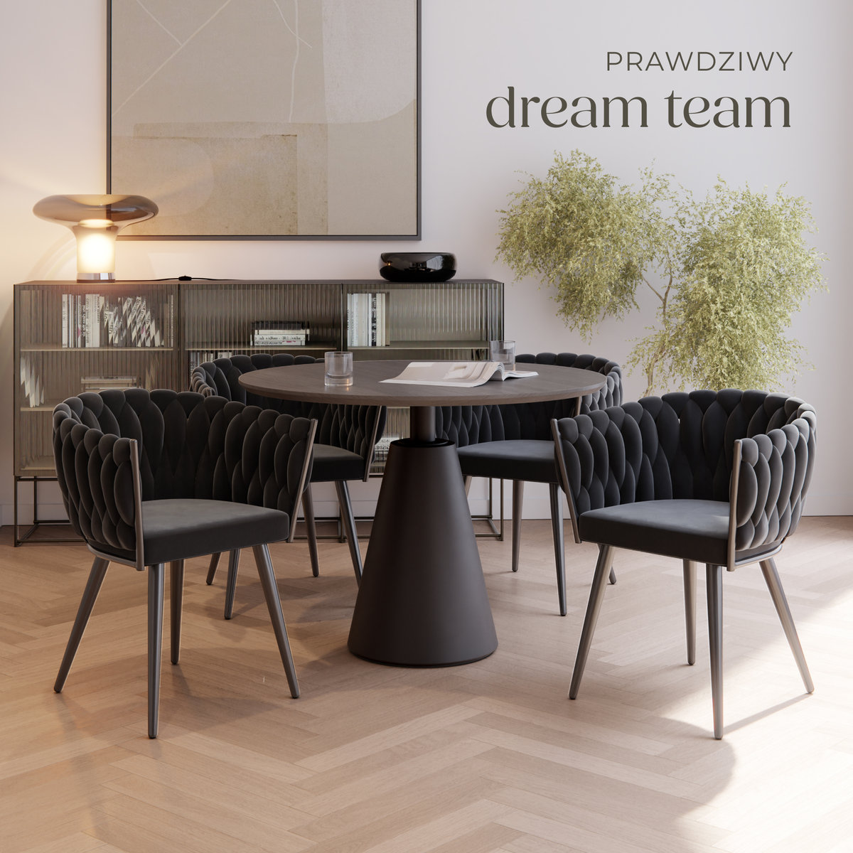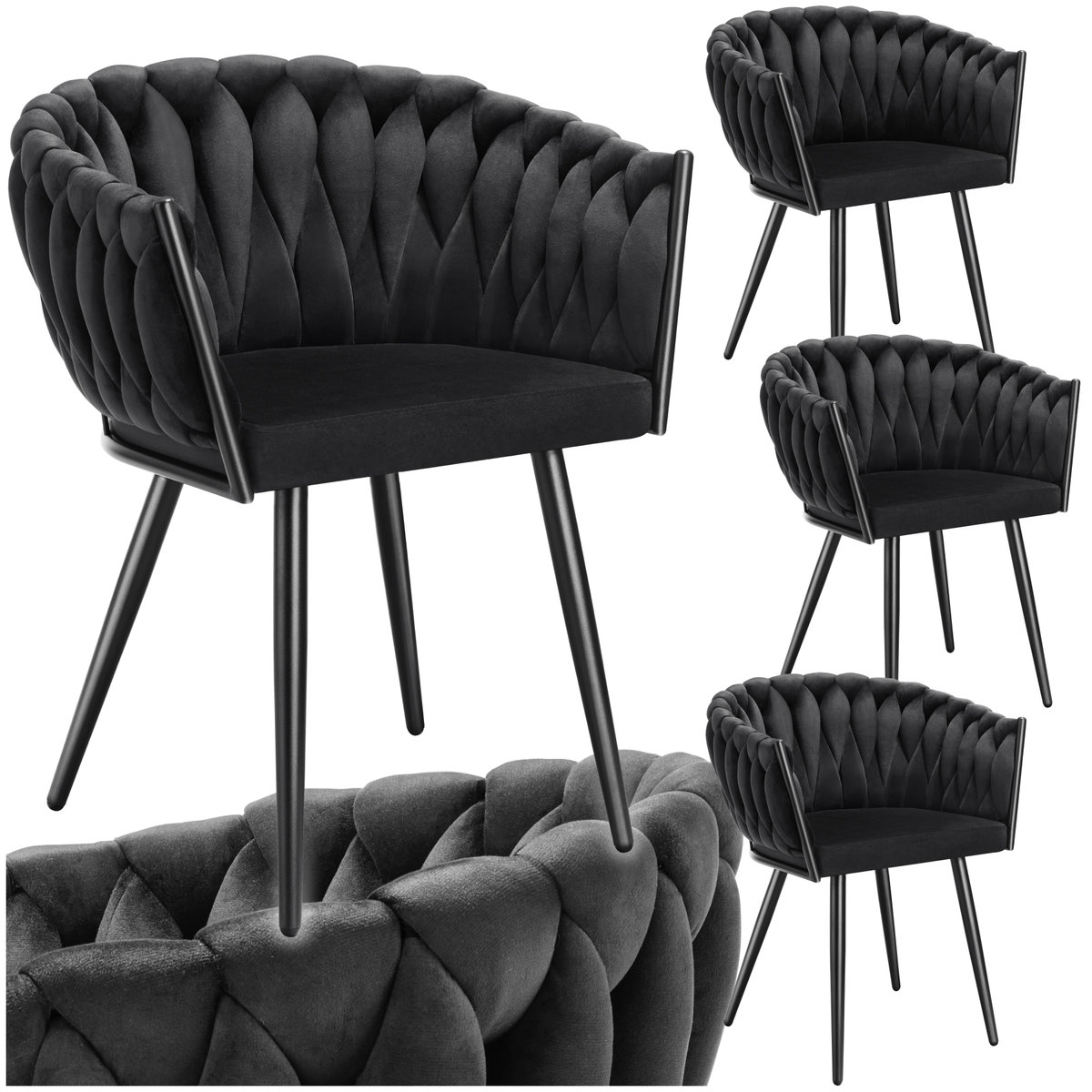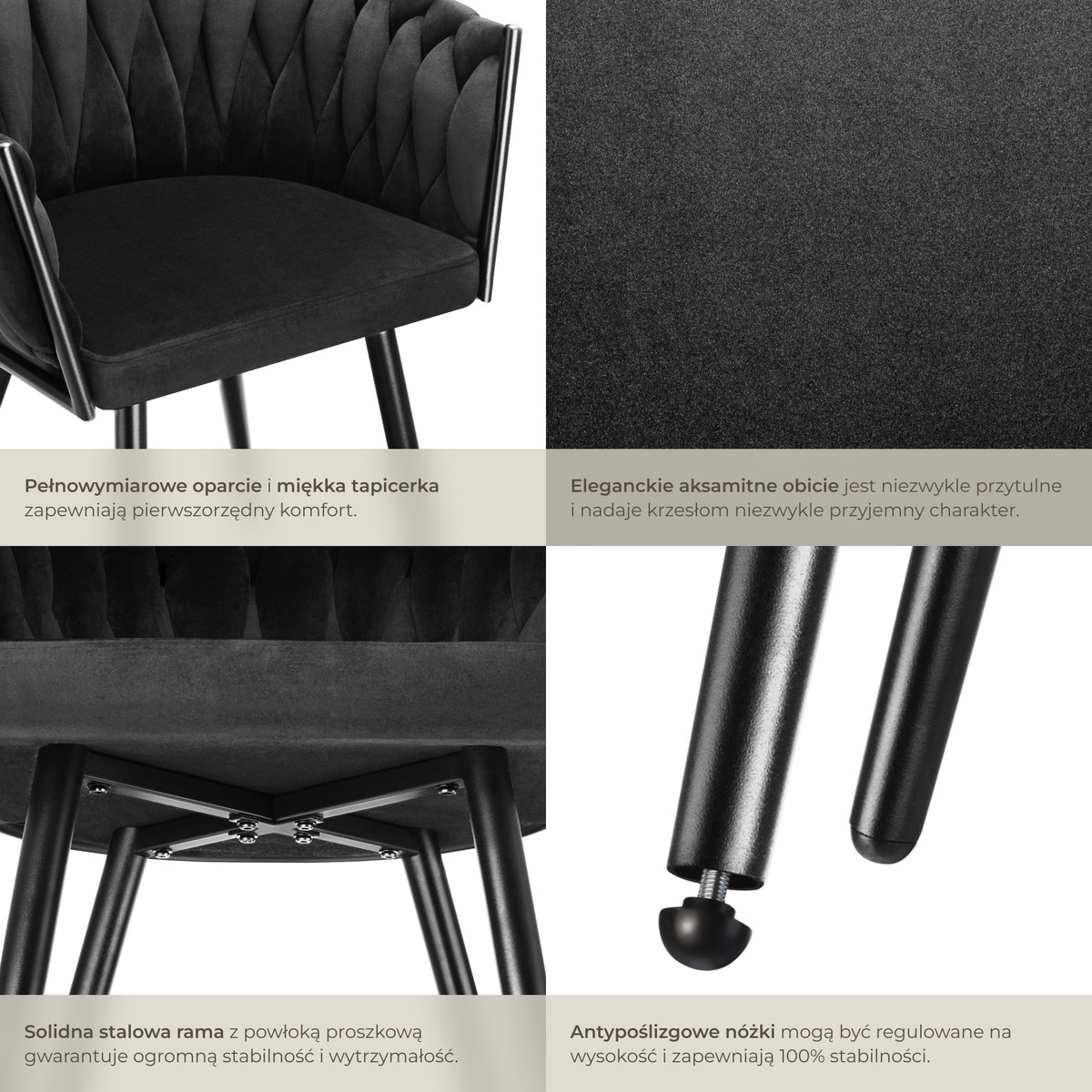 Krzesła te wyznaczają nowe standardy w zakresie stylu i komfortu: elegancki pleciony wygląd przyciąga wzrok w każdym nowoczesnym salonie, a duże siedzisko, otoczone podłokietnikami i oparciem, oferuje wyjątkową wygodę dzięki wypełnieniu z pianki o dużej gęstości i wyjątkowo delikatnemu aksamitnemu pokryciu - idealne na długie wieczory przy stole.