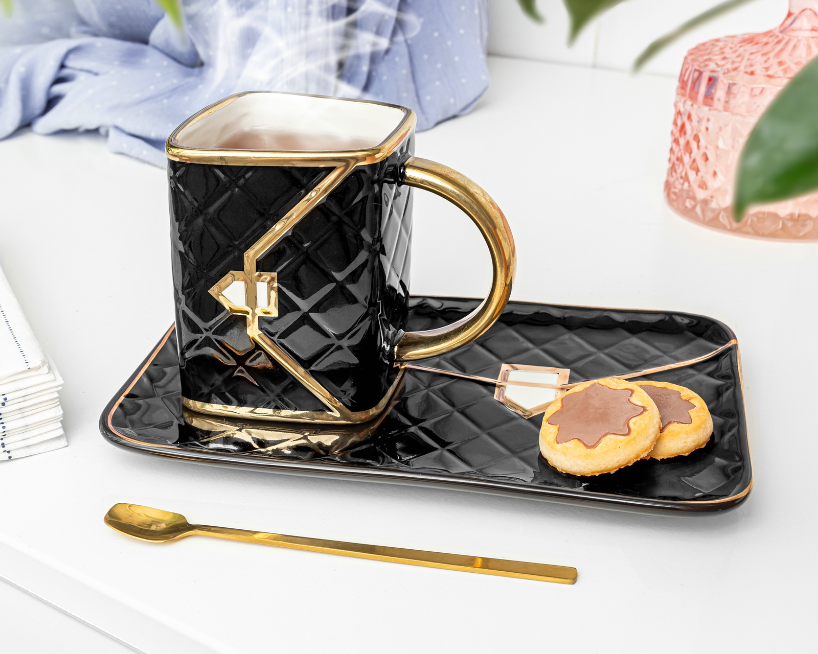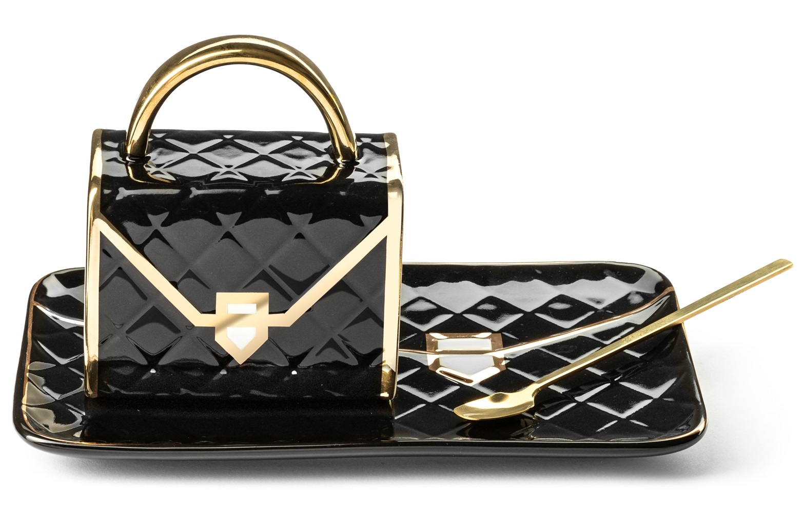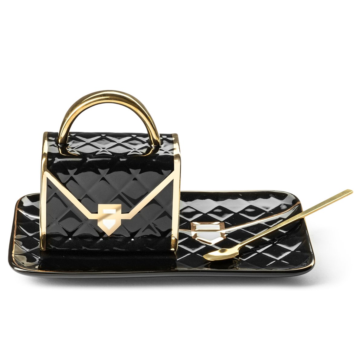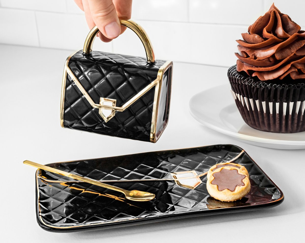 Szukasz wyjątkowego prezentu dla wyjątkowej kobiety? Nasz elegancki kubek z podstawką i złotą łyżeczką to świetna propozycja na taki niebanalny upominek. W naszym zestawie znajdują się właściwie aż dwie torebki! Kubek jest zgrabnym i eleganckim kuferkiem, podstawka zaś to stylowa torebka kopertówka.