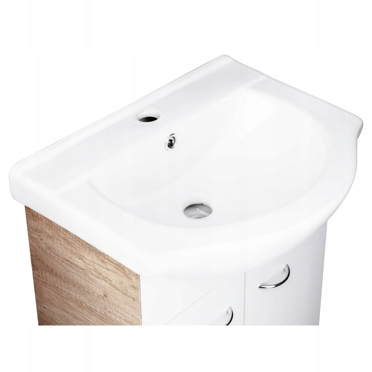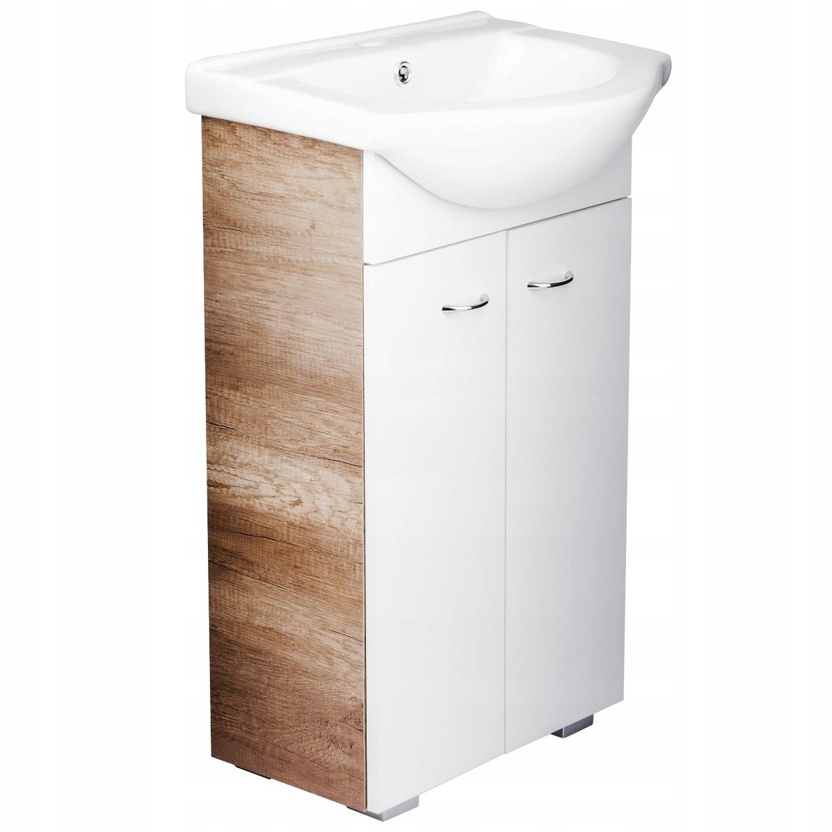 Szafka łazienkowa TIM 50 stojąca z syfonem i baterią składa się z umywalki ceramicznej o szerokości 50 cm oraz szafki z drzwiczkami w kolorze białym. Boki mebla wykonane zostały w kolorze dębu monumentalnego.