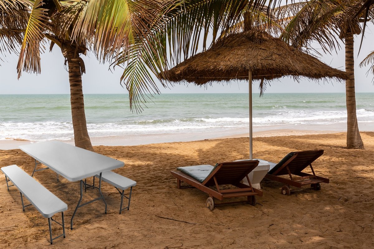 STÓŁ Z ŁAWKAMI – składany zestaw mebli ogrodowych to idealne rozwiązanie na wszystkie plenerowe imprezy oraz wydarzenia. Jest niezwykle praktyczny i wygodny. Posiada mocną konstrukcję oraz gruby blat – wszystko to odporne na niesprzyjające warunki atmosferyczne. Wystarczy kilka prostych ruchów, aby stworzyć na swoim ogródku idealny kącik gastronomiczny, który sprawdzi się na festynach, dużych imprezach oraz grillach.