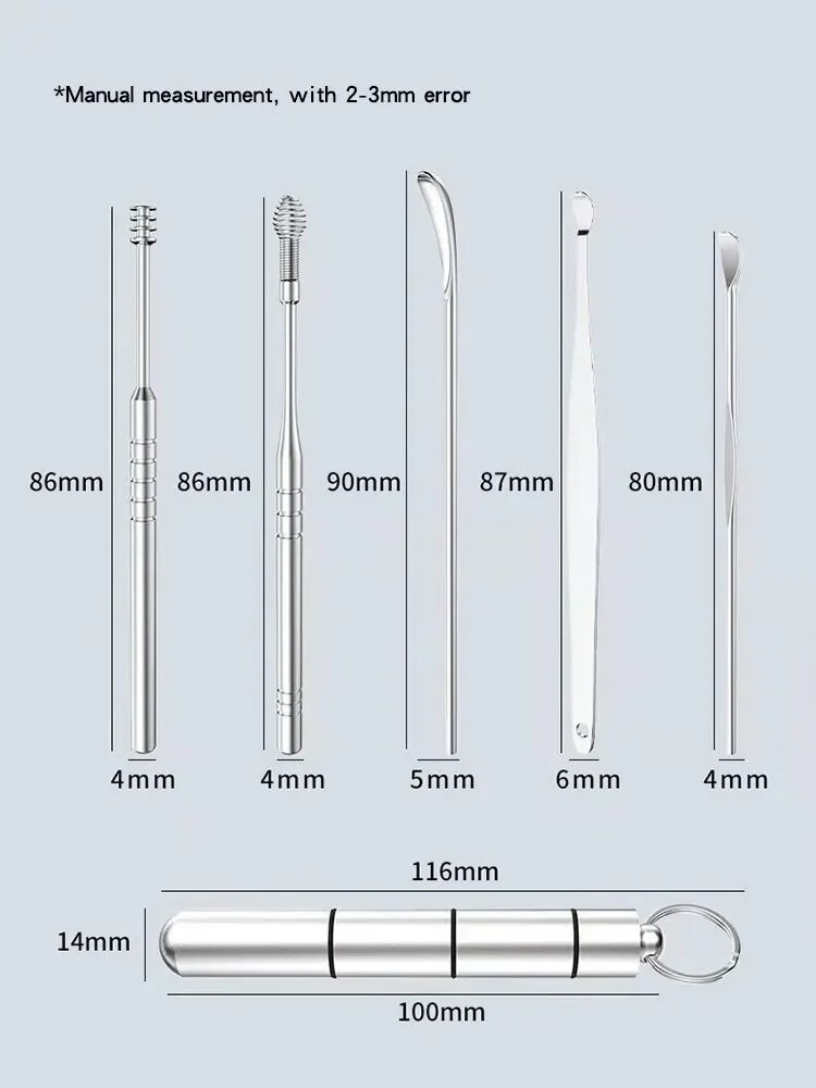 Narzędzia do usuwania woskowiny z uszu✨ 6 sztuk + etui ✨Nie musisz kupować wszystkiego osobno, poznaj zestaw do usuwania woskowinyWykonany z najwyższej jakości medycznej stali nierdzewnej, trwały i ...