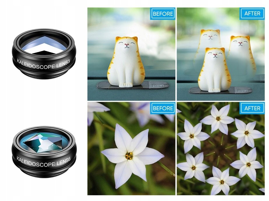 Obiektywy kalejdoskopowe 3 i 8 oferują unikalną możliwość eksperymentowania z efektami wizualnymi, tworząc zdjęcia, które są prawdziwymi dziełami sztuki. Przekształcają one prozaiczne sceny w hipnotyzujące wzory i tekstury, dodając magii i oryginalności do Twoich fotografii. Są świetnym narzędziem do eksploracji kreatywnej i wyróżnienia się w mediach społecznościowych.