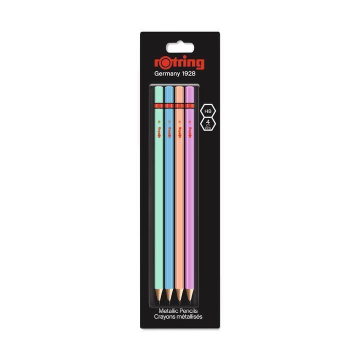 Zestaw 4 ołówków drewnianych Rotring. Kolor metallic: 1 x różowy, 1 x zielony, 1 x niebieski, 1 x liliowy. Twardość grafitu: HB Opakowanie typu blister.