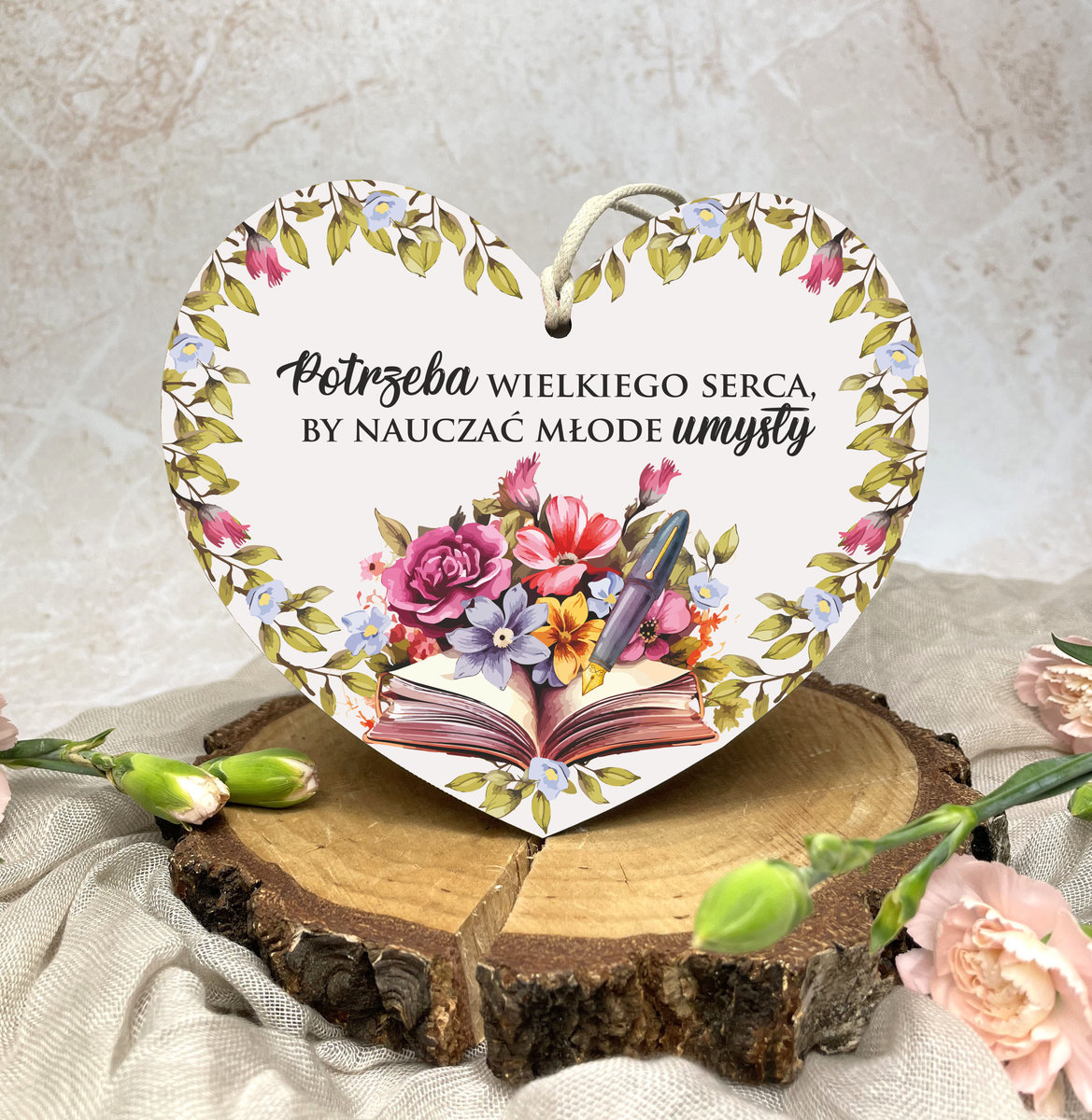 W zestawie znajduje się drewniana zawieszka w kształcie serca z kolorwym nadrukiem. Tekst na zawieszce jest stały i nie podlega modyfikacjom.