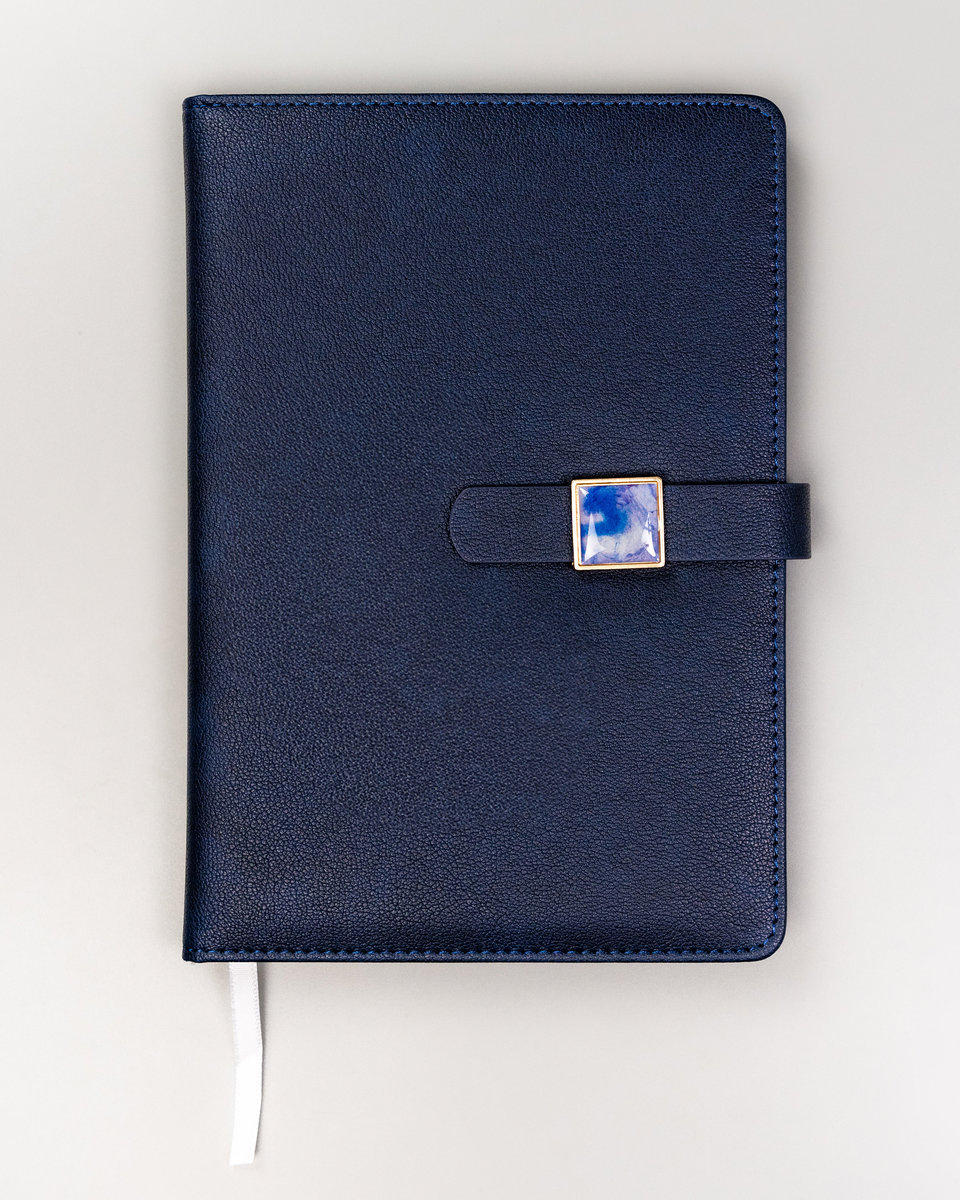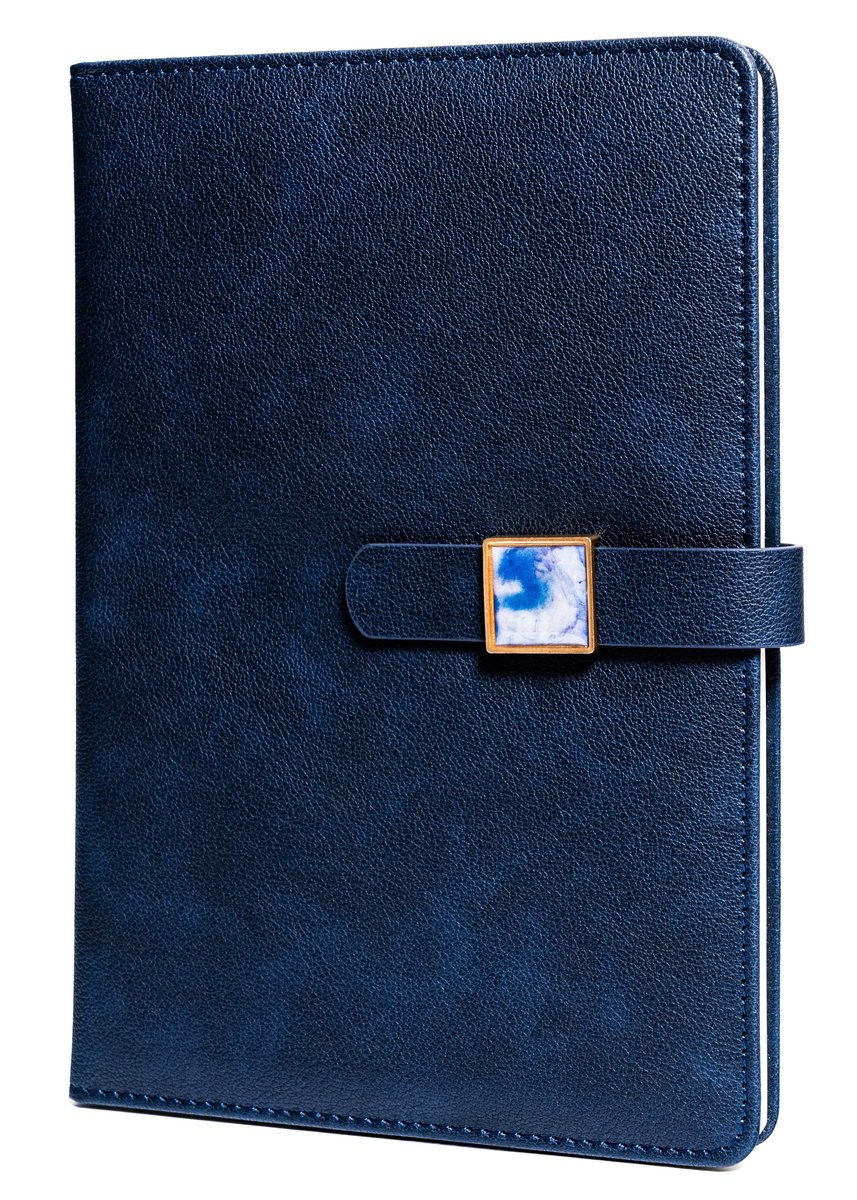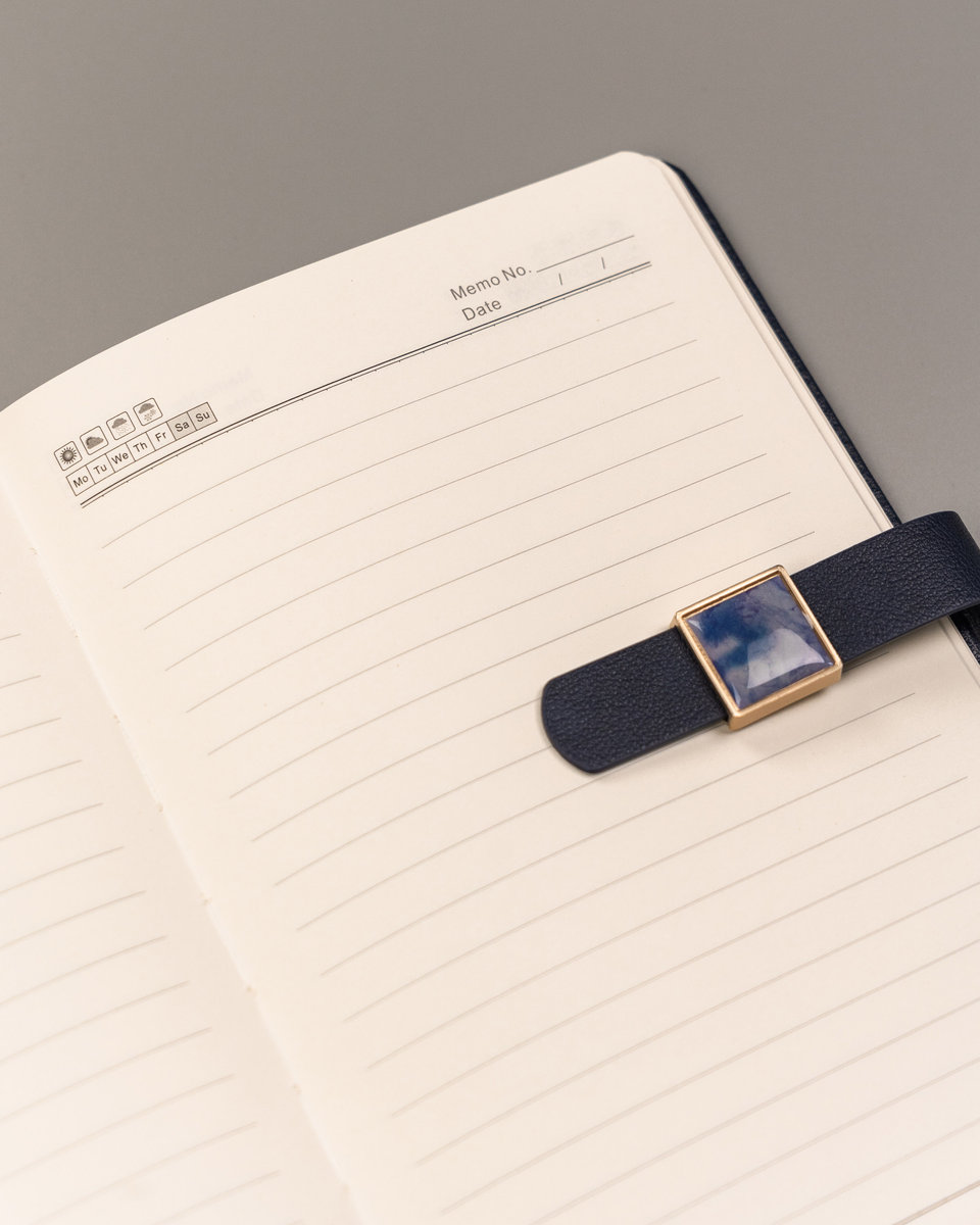 Granatowa okładka notesu wykonana została z materiału imitującego naturalną skórę, co nadaje mu ekskluzywny charakter i zapewnia trwałość. Uwagę przyciąga ozdobna klamra z magnetycznym zapięciem, wykończona złotą ramką i subtelnym, marmurkowym akcentem. Notes jest nie tylko piękny, ale też praktyczny – strony w linie pozwalają na przejrzyste prowadzenie notatek, a biała tasiemka pełni funkcję zakładki. Idealny wybór dla kobiet, które chcą mieć stylowy organizer zawsze pod ręką.