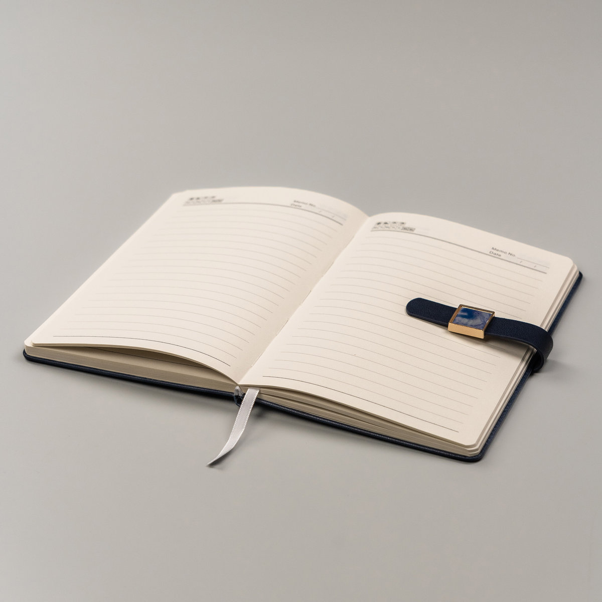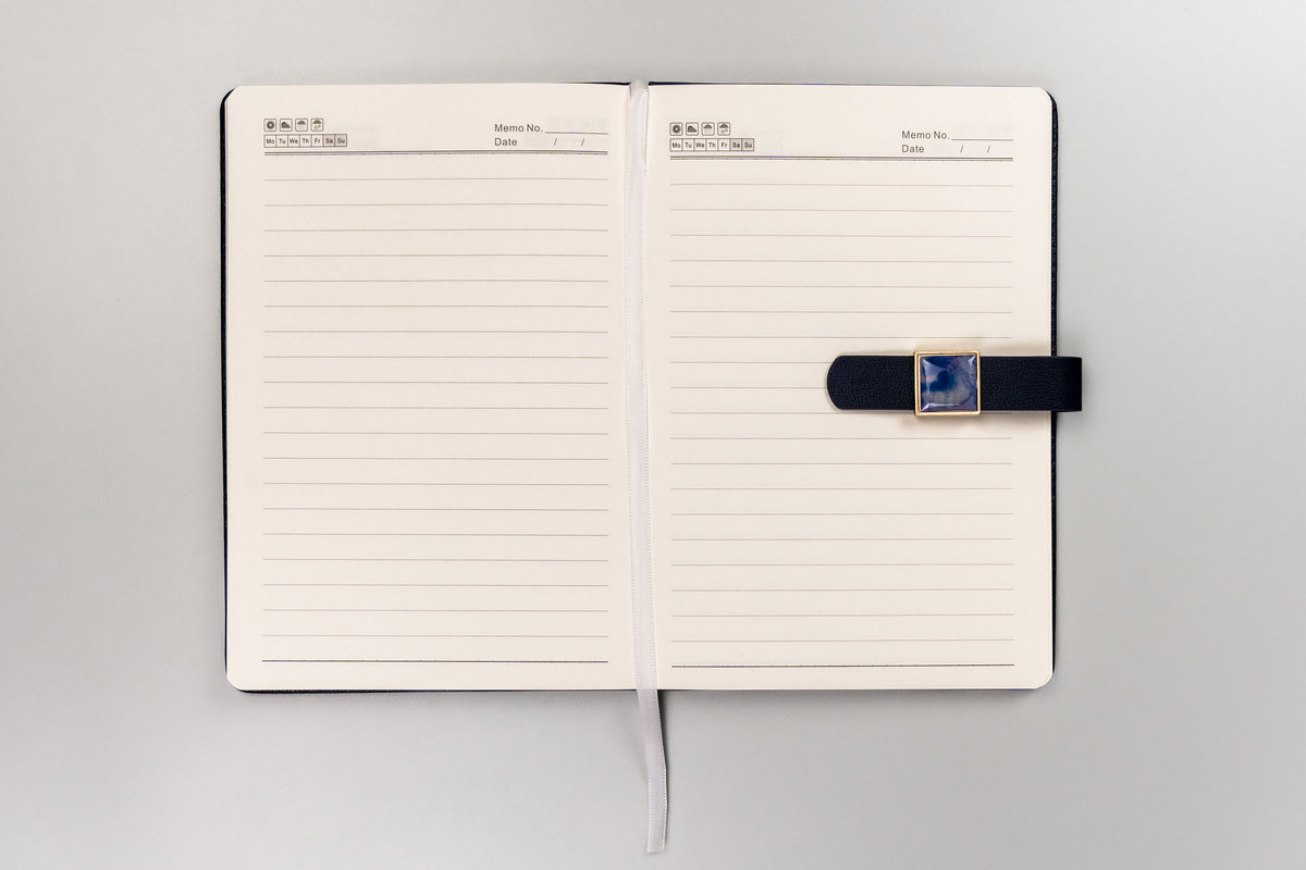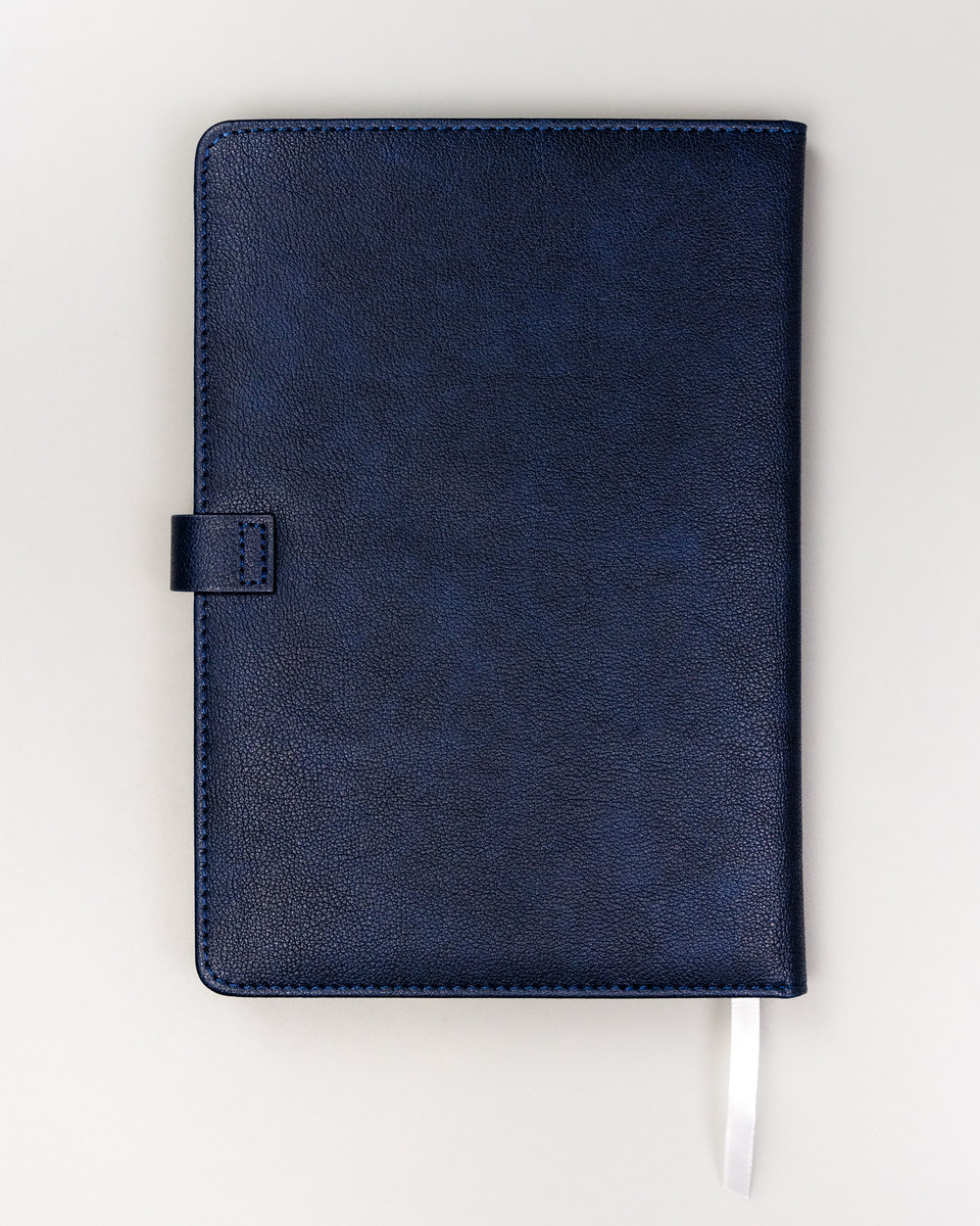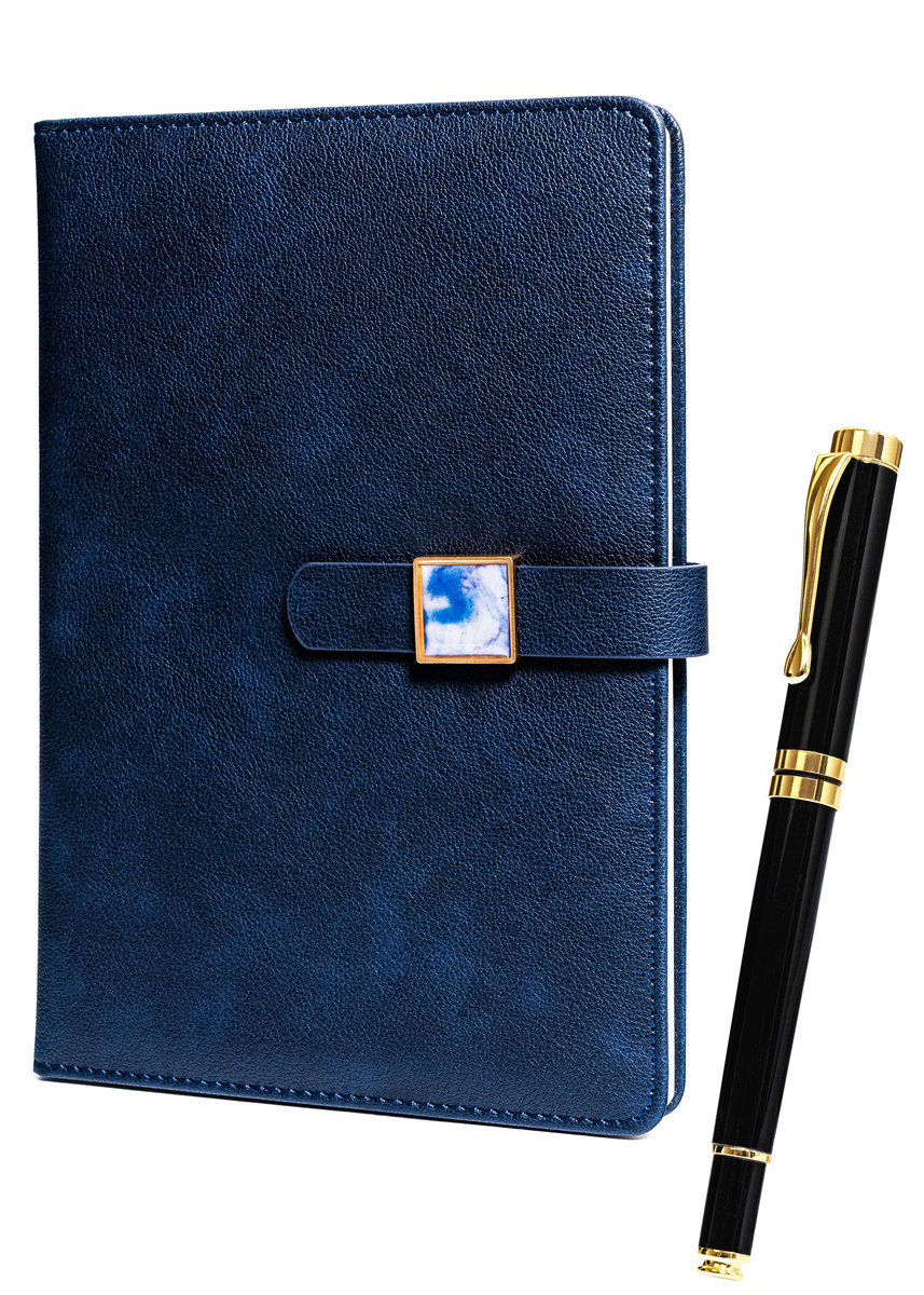 Granatowa okładka notesu wykonana została z materiału imitującego naturalną skórę, co nadaje mu ekskluzywny charakter i zapewnia trwałość. Uwagę przyciąga ozdobna klamra z magnetycznym zapięciem, wykończona złotą ramką i subtelnym, marmurkowym akcentem. Notes jest nie tylko piękny, ale też praktyczny – strony w linie pozwalają na przejrzyste prowadzenie notatek, a biała tasiemka pełni funkcję zakładki. Idealny wybór dla kobiet, które chcą mieć stylowy organizer zawsze pod ręką.