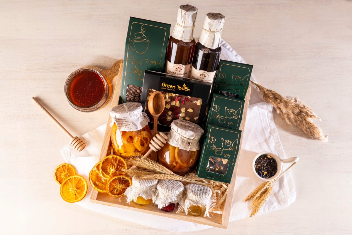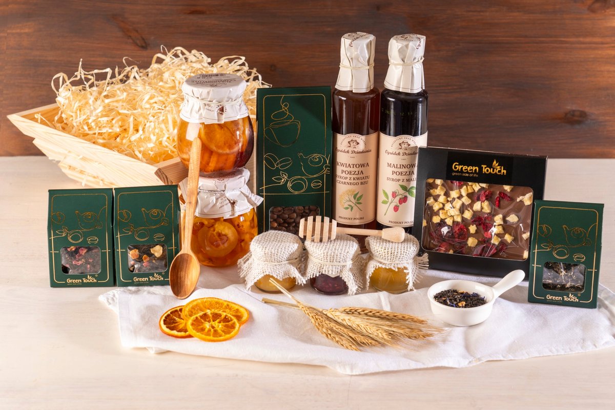 • Herbata zielona liściasta z dodatkami marki Green Touch (15 g) – delikatna i orzeźwiająca zielona herbata, również w ozdobnym pudełku.