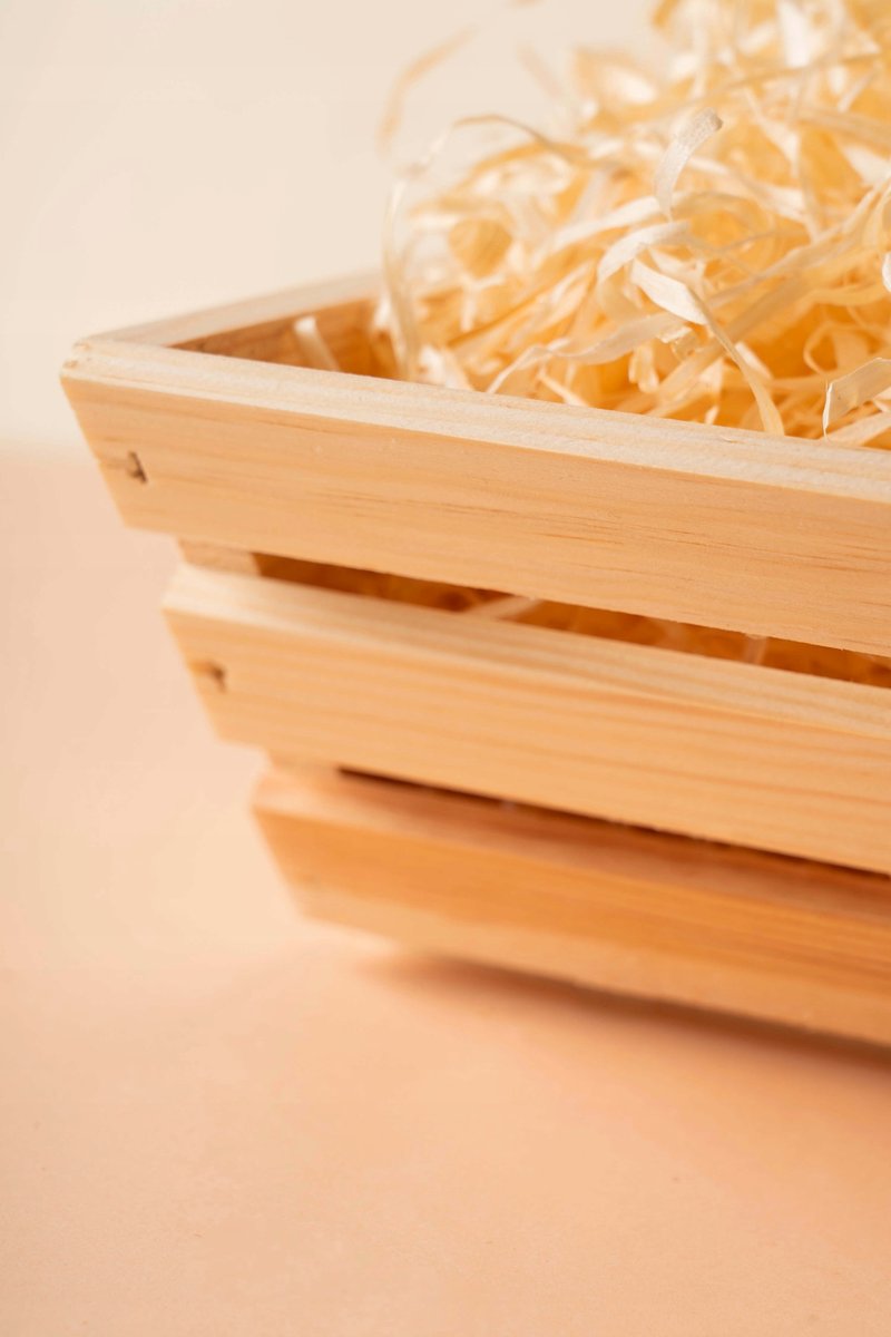 Prezent wypełniony wełną drzewną lub papierem ozdobnym. Całość skompletowana z dokładnością i zafoliowana stanowi gotowy do wręczenia prezent. Pozostałą po prezencie skrzynkę można wykorzystać np. jako pojemnik na owoce.