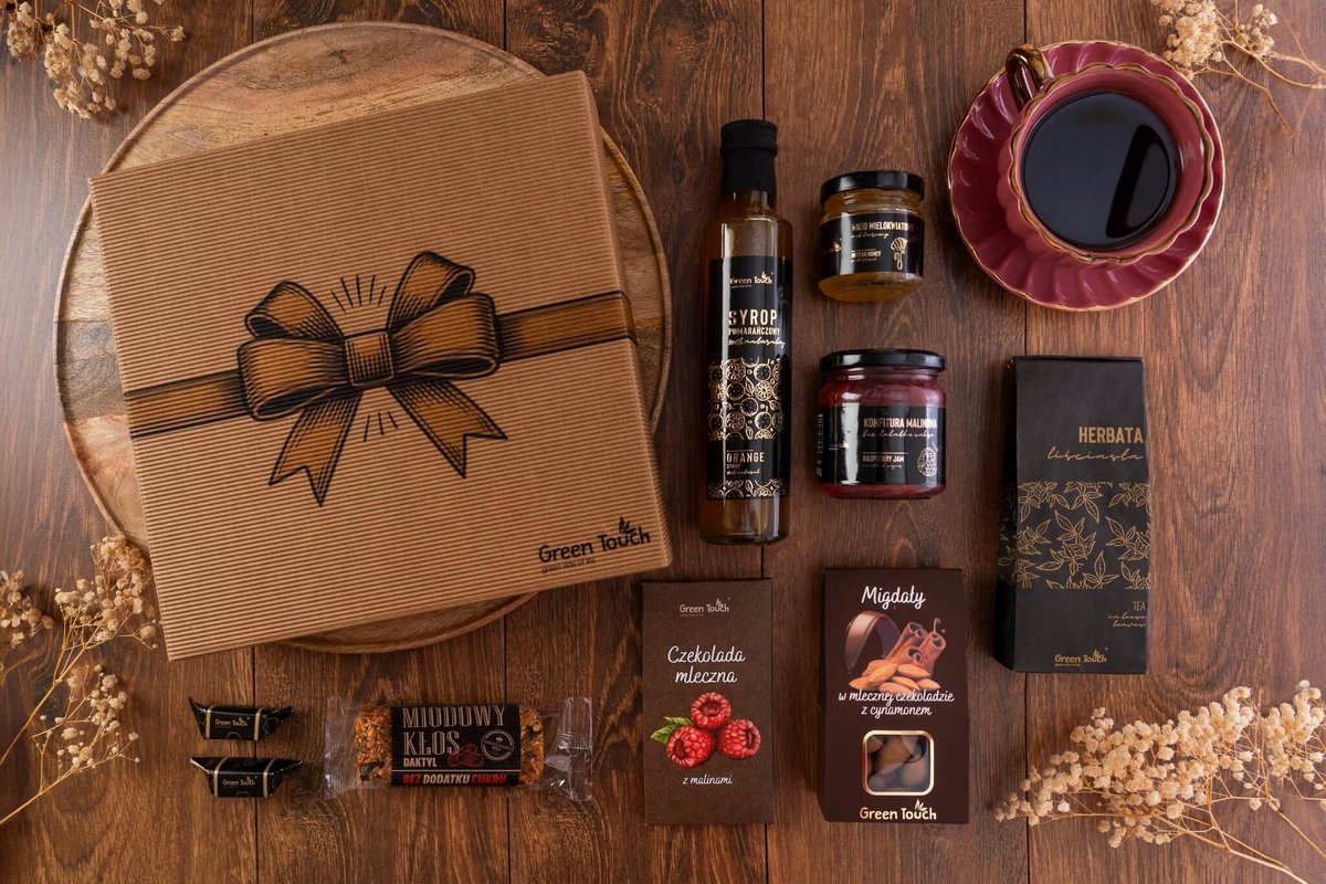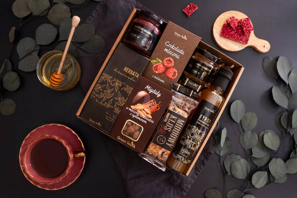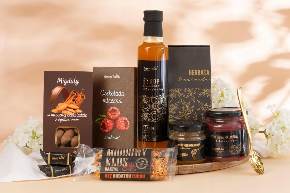 Zestaw zawiera czarną liściastą herbatę gatunkową z dodatkiem owoców, zapewniającą intensywny smak oraz bogaty aromat. Towarzyszą jej migdały w mlecznej czekoladzie oprószone cynamonem, mleczna czekolada z dodatkiem malin liofilizowanych oraz konfitura malinowa bez dodatku cukru. Całość wzbogaca naturalny syrop pomarańczowy, idealny jako dodatek do napojów i deserów, polski miód wielokwiatowy oraz baton miodowy kłos z daktylem. Kompozycję dopełniają ręcznie robione krówki mleczne z miodem wielokwiatowym.