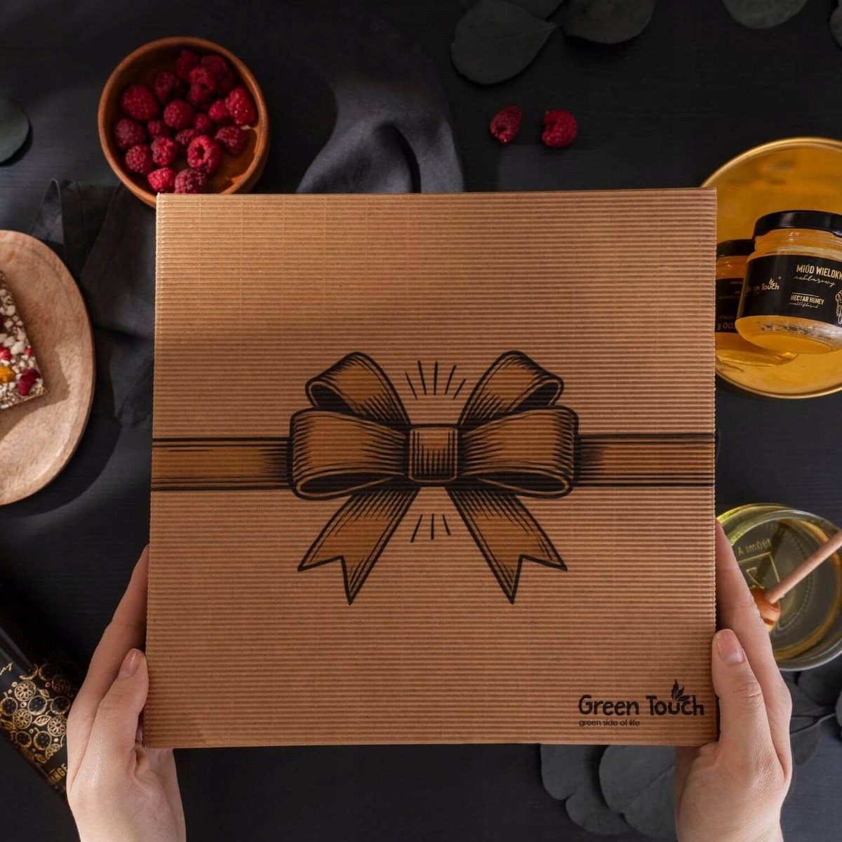 Całość zapakowana jest w solidne pudełko z ryflowanej tektury o wymiarach 25 × 25 × 8 cm. Wieko ozdobione jest nadrukiem w formie kokardy, nadając całości eleganckiego charakteru. Dzięki temu prezent jest gotowy do wręczenia bez potrzeby dodatkowego pakowania.