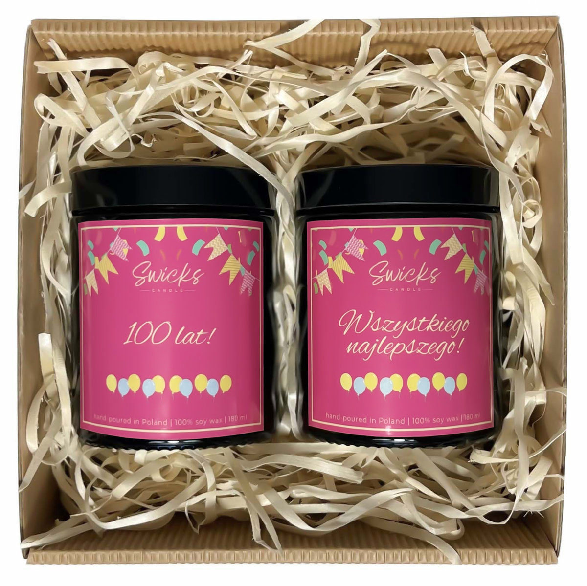 Zestaw świec sojowych w pudełku prezentowym z napisami Wszystkiego najlepszego oraz Sto Lat 2x180ml W skład zestawu wchodzą dwie świece sojowe, każda o pojemności 180 ml. Świece zapakowane są ...