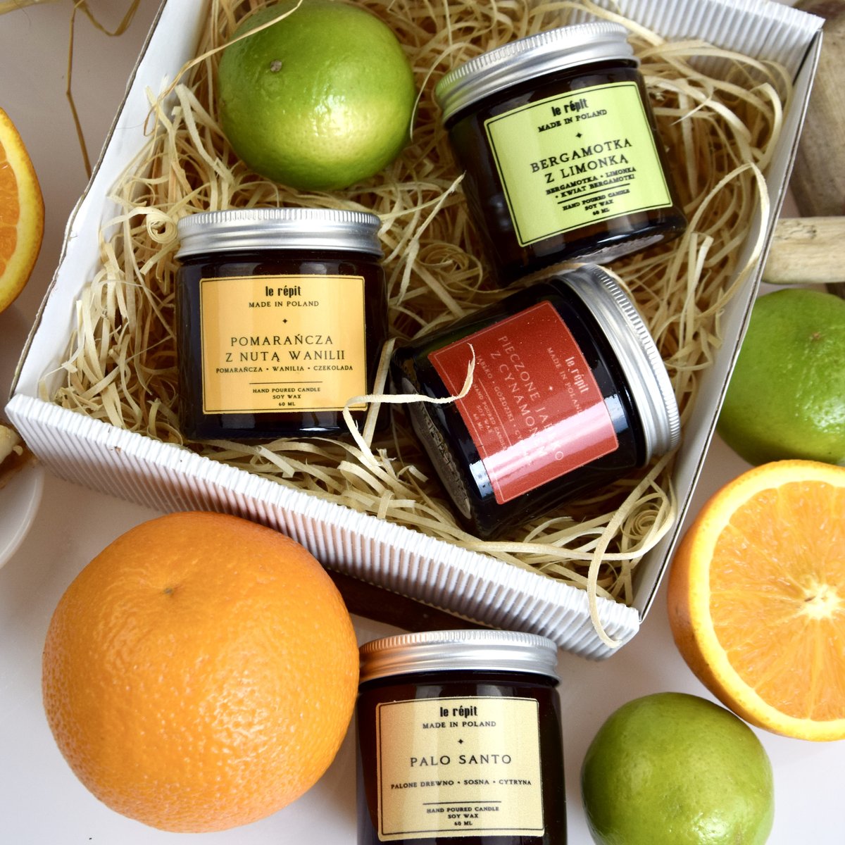 Właśnie zrecenzowałem Zestaw Prezentowy - Świece Sojowe Zapachowe 4X60 Ml. Hand Made: Pomarańcza Z Nutą Wanilii, Pieczone Jabłko Z Cynamonem, Palo Santo, Bergamotka Z Limonką