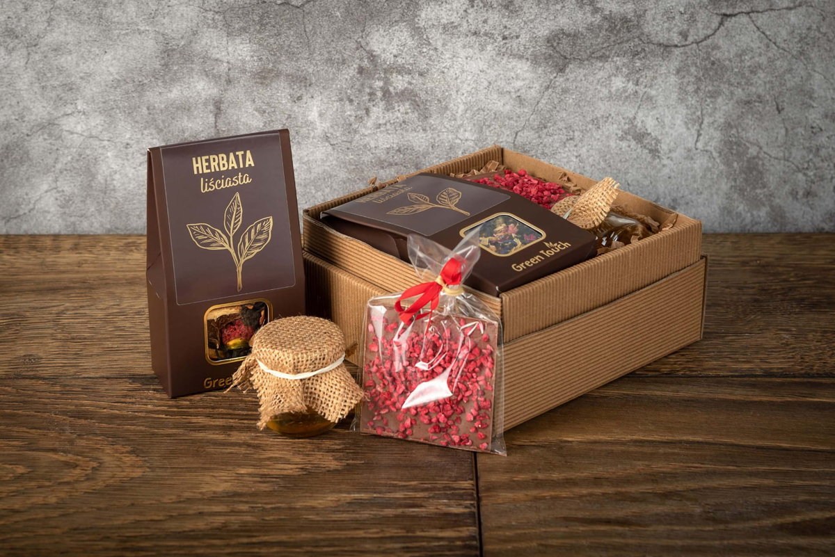 Naturalny upominek w postaci dobrej herbaty;czekolady z manufaktury i miodka. Całość zamknięta w ozdobnym karbowanym kartoniku prezentowym z wypełnieniem w postaci kraftowego papieru