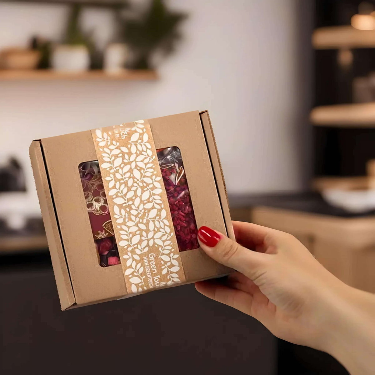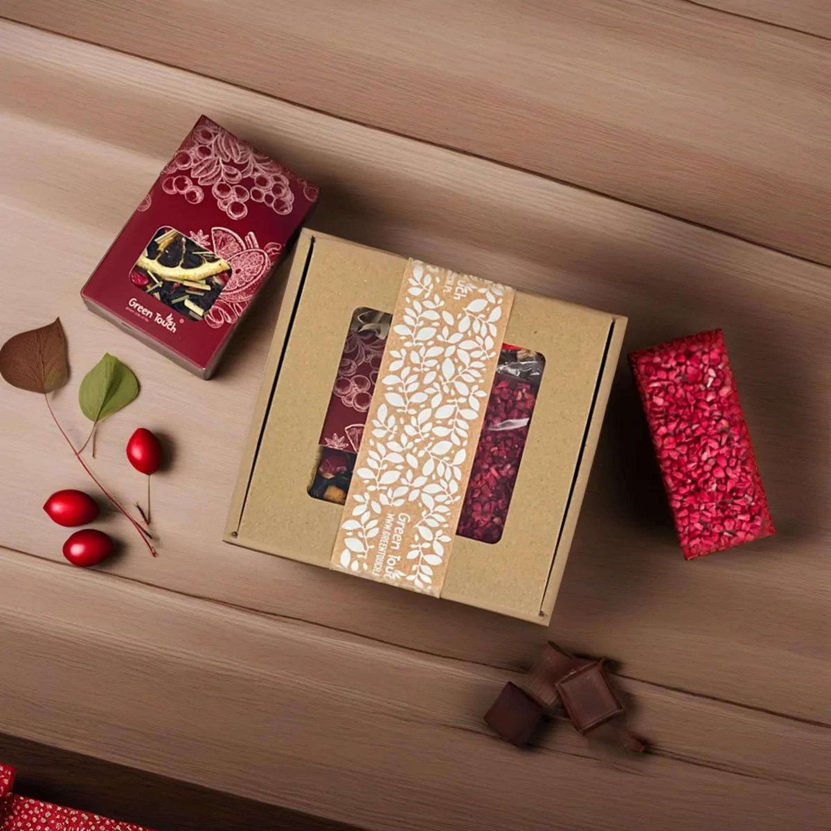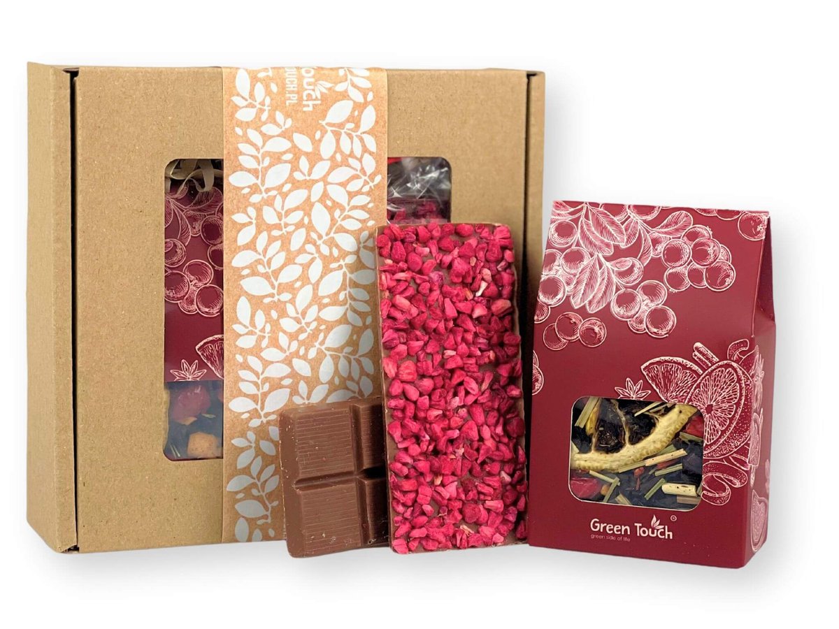 Doskonały upominek i świetna alternatywa dla popularnych kwiatów. Zestaw herbata z kraftową czekoladką, całość w czerwonym motywie.