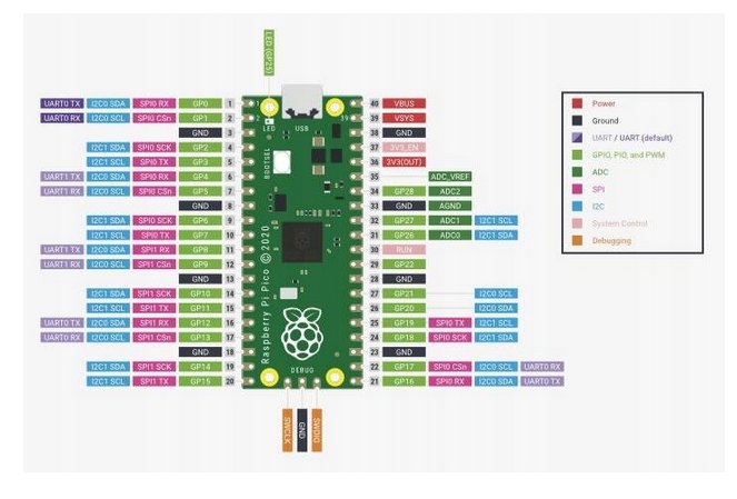- Wbudowana pamięć SRAM 264 kB i Flash 2 MB 26 wielofunkcyjnych pinów GPIO (23 tylko cyfrowe, 3x ADC) 2x SPI, 2x I2C, 2x UART, 3x 12-bitowe przetworniki ADC oraz 16 kontrolowanych kanałów PWM Pico można zamontować powierzchniowo jako moduł